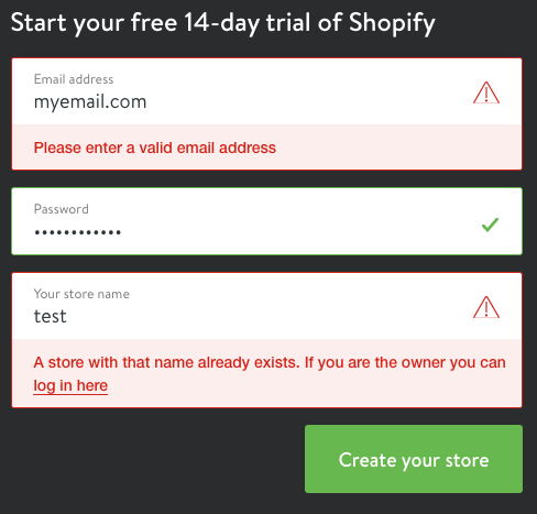 "Given the benefits of confirming appropriate answers in real time, you might be tempted to consider using inline validation for all the questions you pose in your forms. [...] If you do choose to provide inline validation for many of the questions you ask, timing is everything. [...] I've only managed to enter the first letter of my email address, and I'm already faced with an error. A much better approach is to only provide feedback when it's clear someone is done providing an answer.