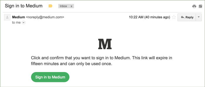 "That’s right, no passwords. When you want to sign in to Medium, we’ll send you an email that contains a special sign in link. Clicking on that link will sign you in. That’s all there is to it. If you’ve ever used a “forgot password” feature, it works a lot like that, except you don’t have to forget a password to use it."