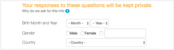"Make that field optional as much as you can. This is part of the previous recommendation — the user may know better than you if it’s safe or appropriate to disclose the information based on the context. It may even warm them up to answer the question accurately rather than skipping it."