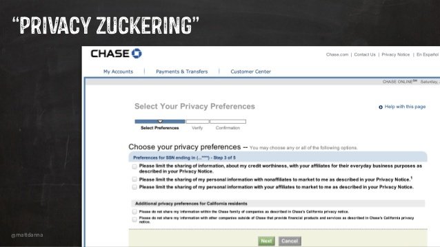 "You are tricked into publicly sharing more information about yourself than you really intended to. Named by Tim Jones as a homage to Facebook CEO Mark Zuckerberg. In its early days, Facebook had a reputation for making it difficult for users to control their privacy settings, and generally making it very easy to "overshare" by mistake. [...] Here's how it works: when you use a service (e.g. a store card), the small print hidden in the Terms and Conditions gives them permission to sell your personal data to anyone. Data brokers buy it and combine it with everything else they find about you online into a profile, which they then resell."