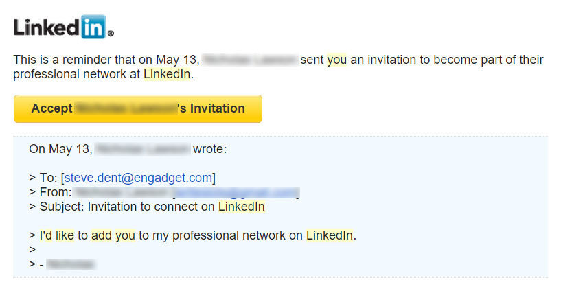 "The product asks for your email or social media permissions under the pretence it will be used for a desirable outcome (e.g. finding friends), but then spams all your contacts in a message that claims to be from you. The most famous example of this dark pattern was used by Linkedin, which resulted in them being fined $13 million dollars as part of a class action lawsuit in 2015. [...] The hidden agenda is that they want this access so they can secretly send invitation emails to all of your contacts, falsely claiming to be sent by you rather than by Linkedin."