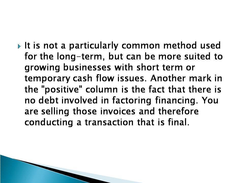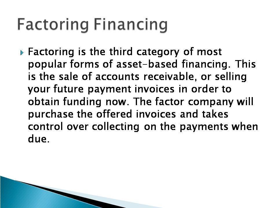 One of the most common methods to achieve financing is known as accounts receivable financing. It involves a secured loan wherein the accounts receivable are used as collateral in exchange for a cash sum that will be paid within a short term period. Typically this type of financing is used to assist businesses with a short term cash problem.