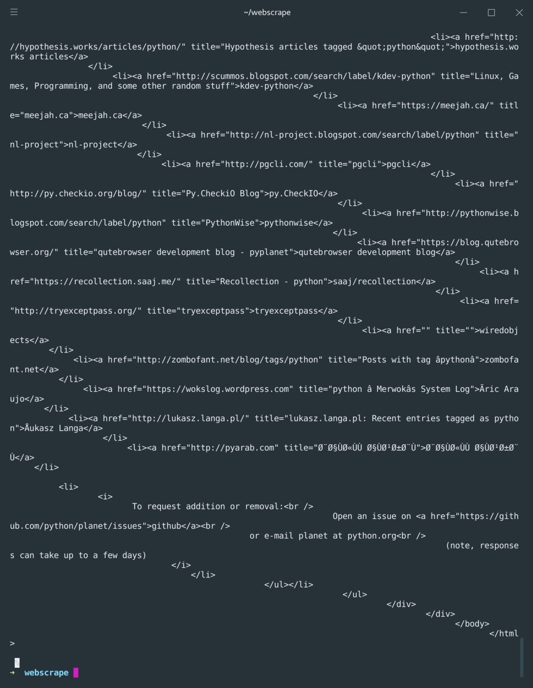 url = "http://planetpython.org" source = requests.get(url) print(source)