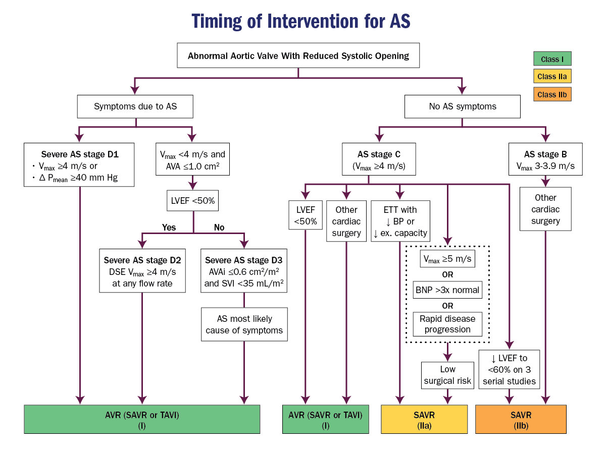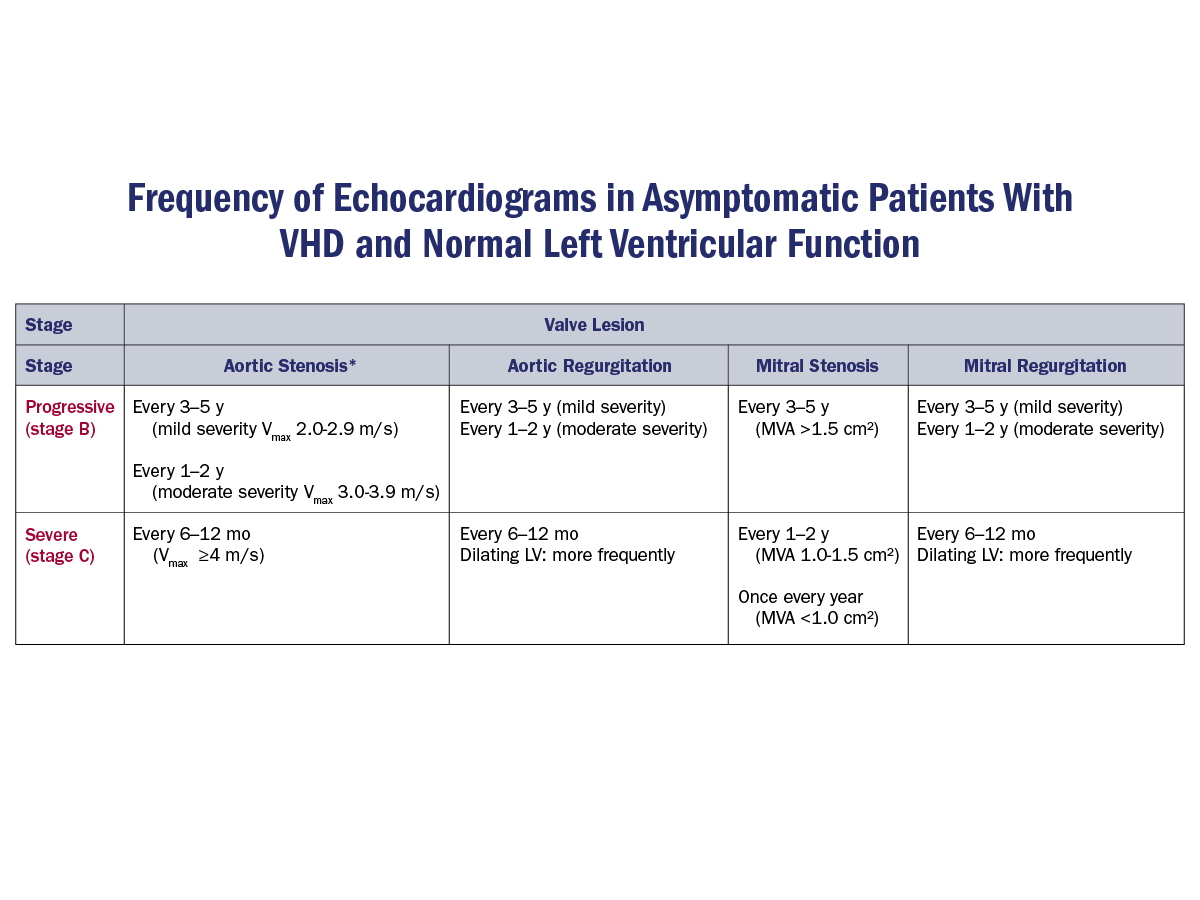 The timing of periodic clinical evaluation of patients with severe asymptomatic AS depends on comorbidities and patient-specific factors. Transthoracic echocardiogram for re-evaluation of asymptomatic patients with AS with normal left ventricular systolic function who have no change in signs or symptoms is performed at intervals of 6 months to 1 year when aortic velocity is greater than equal to 4.0 m/sec (stage C), 1-2 years when aortic velocity is 3.0-3.9 m/sec (stage B), and 3-5 years when aortic velocity is 2.0-2.9 m/sec (stage B; Table 1).
