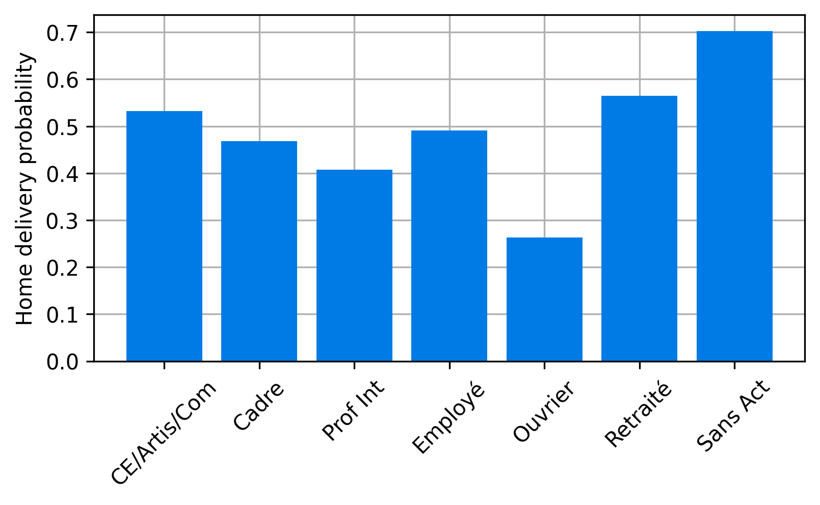 - Based on synthetic population, find average number of purchases delivered to a household defined by socioprofesional class, age of the reference person and household size per day.