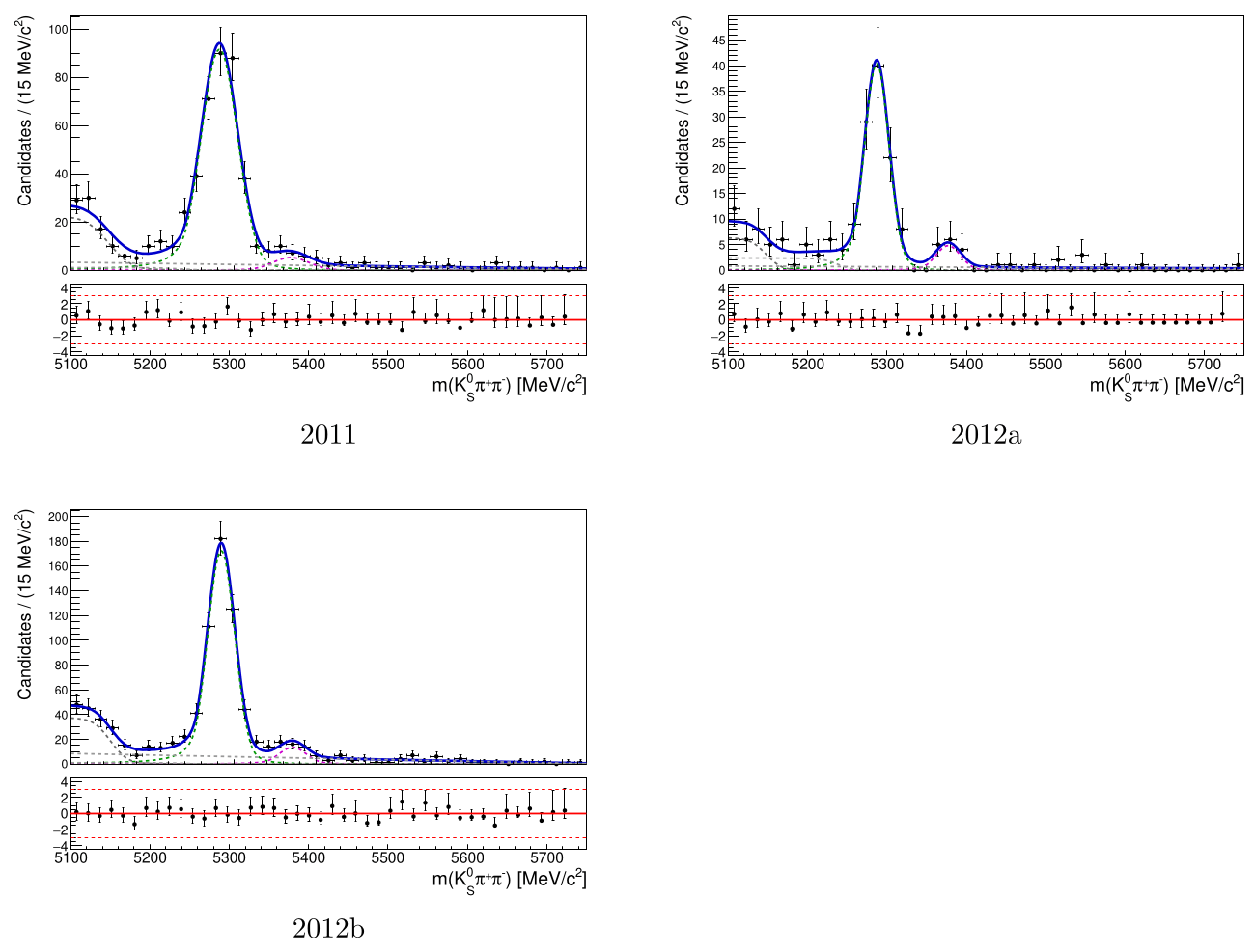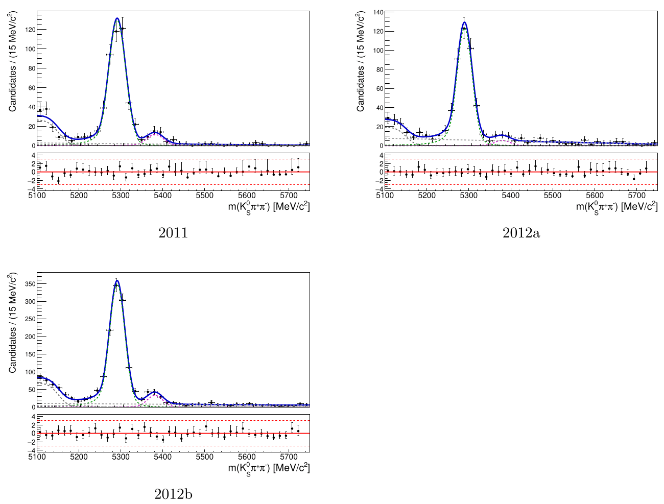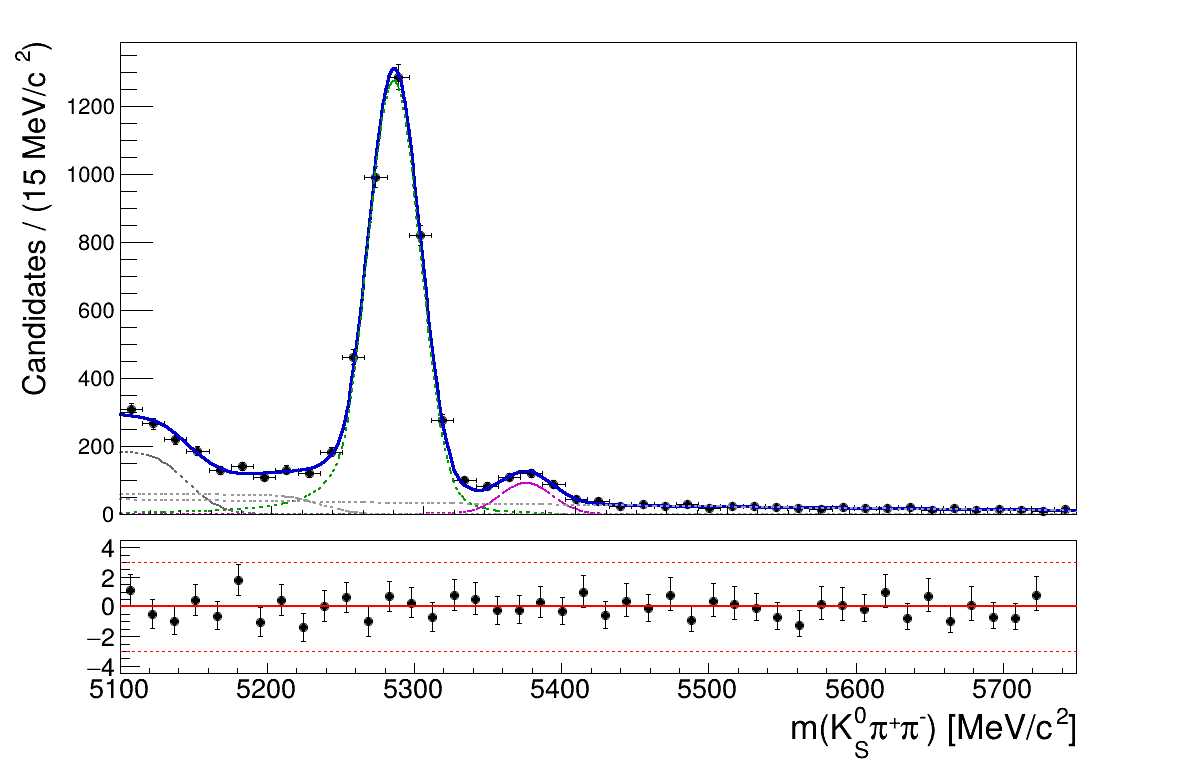 - Obtained from the upper mass side-band \(5450~\text{MeV}\leq m_{K_{S}^{0}\pi^{+}\pi^{-}} \leq 5750~\text{MeV}\)