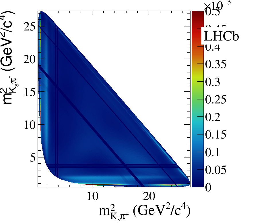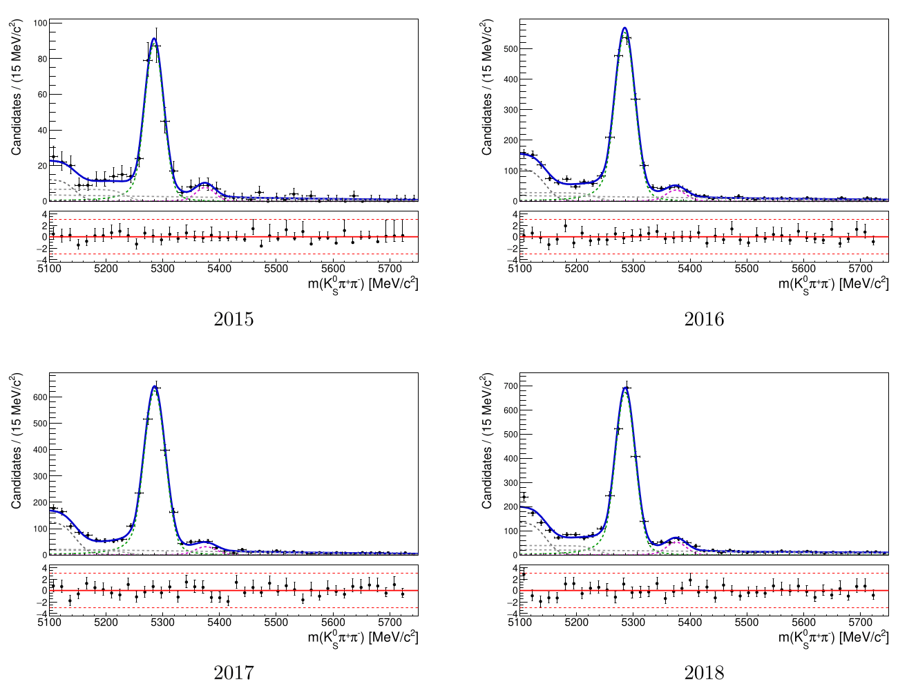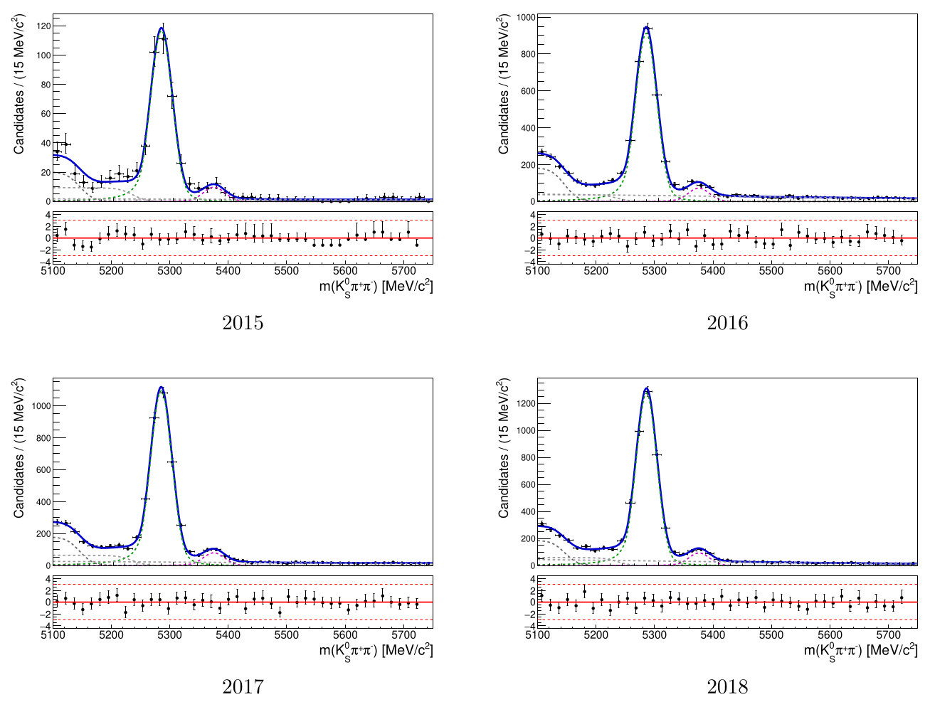 - Obtained from the upper mass side-band \(5450~\text{MeV}\leq m_{K_{S}^{0}\pi^{+}\pi^{-}} \leq 5750~\text{MeV}\)