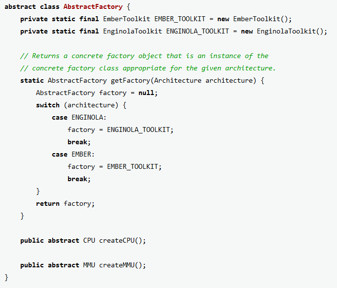 AbstractFactory factory = AbstractFactory.getFactory(Architecture.EMBER);