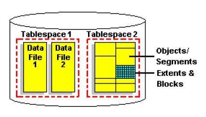 - TableSpace, puede contener muchos segmentos y ser almacenado en varios DataFiles