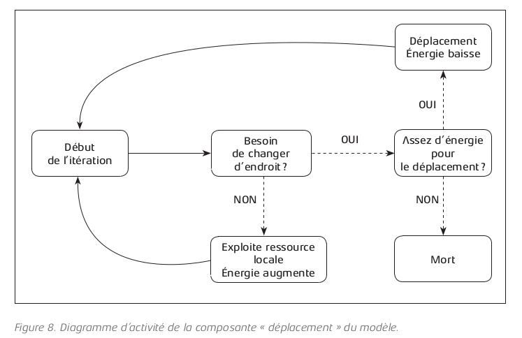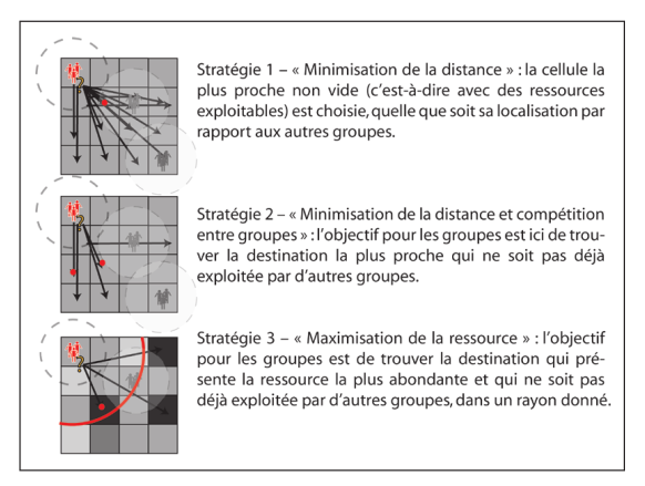 Un flux de groupes migrants pénètre l’espace (représenté par une grille) par le nord-ouest. Ces groupes exploitent les ressources des cellules sur lesquelles ils sont localisés. Face à une pénurie de ressources, le groupe se déplace mais il a aussi une certaine probabilité d’innover qui lui permet de survivre tout en prélevant moins de ressources.