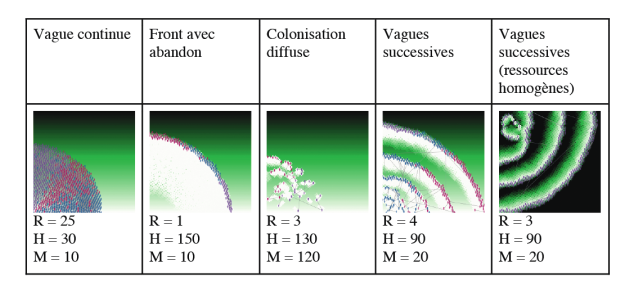 Objectif : Explorer les processus qui conduisent un espace initialement vierge de toute présence humaine à se peupler sous l’effet d’un flux migratoire, et cela dans un contexte de perturbations environnementales. L’objectif est d’explorer les effets de différents paramètres et de différentes situations initiales sur la configuration spatiale et le rythme du peuplement. Le processus central est celui de la migration