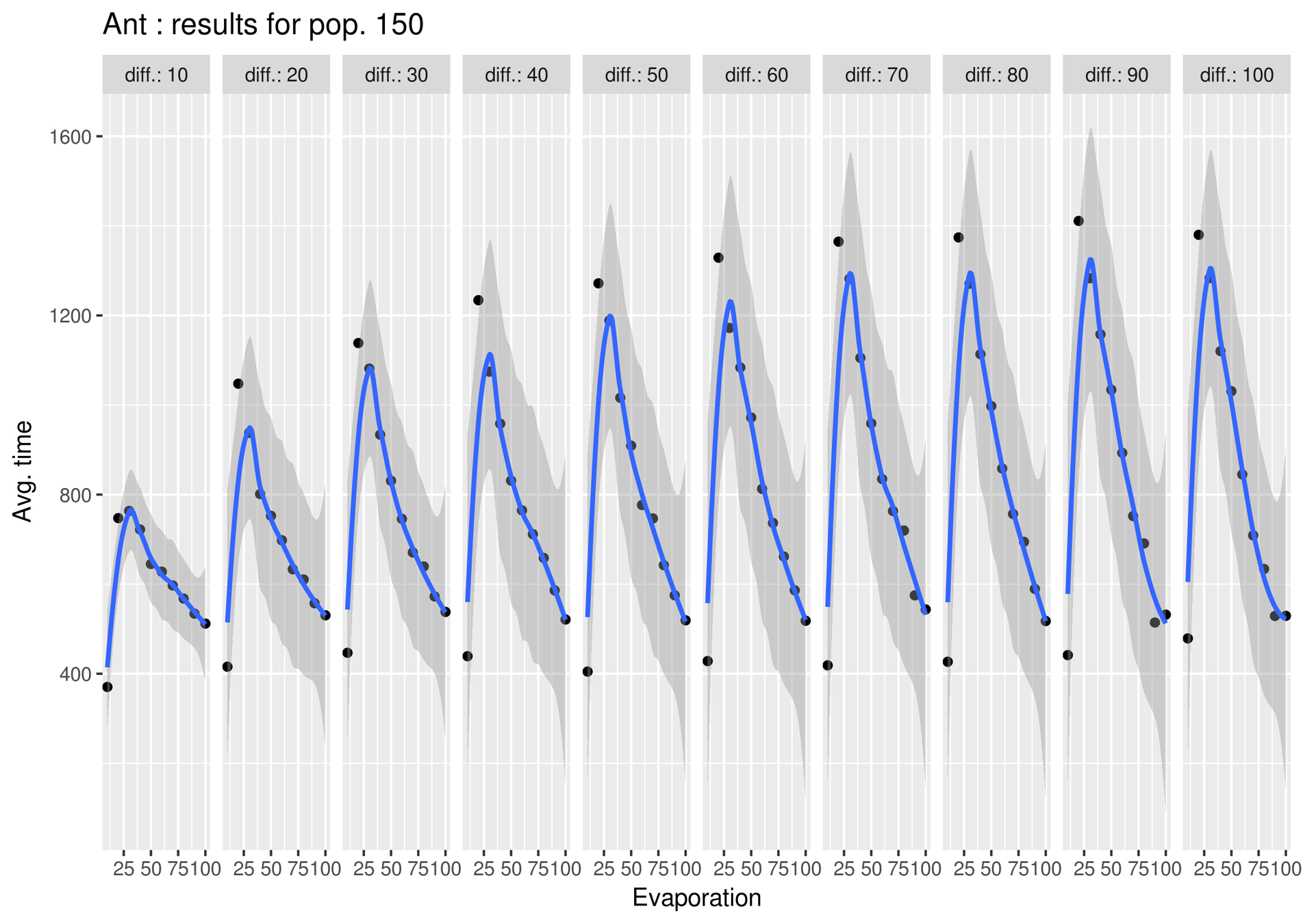 Quelle valeurs de (diffusion, evaporation) minimise le temps de consommation des trois tas de nourriture ?