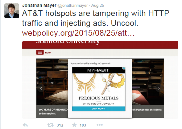 2015: Verizon, AT&T, Vodaphone and others inject tracking IDs into all mobile browsing by their customers [1, 2, 3, 4]