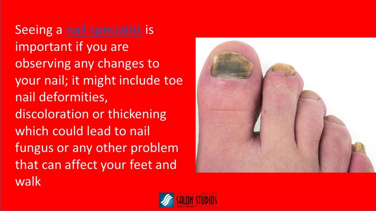 If you observe any changes in your toe nail, it is important to book an app with a nail salon. Known as podiatrist, a nail specialist will be able to diagnose all types of toenail deformities and provide the best treatment or nail care as needed. http://www.selectsalonstudios.com/category/nail-specialists/
