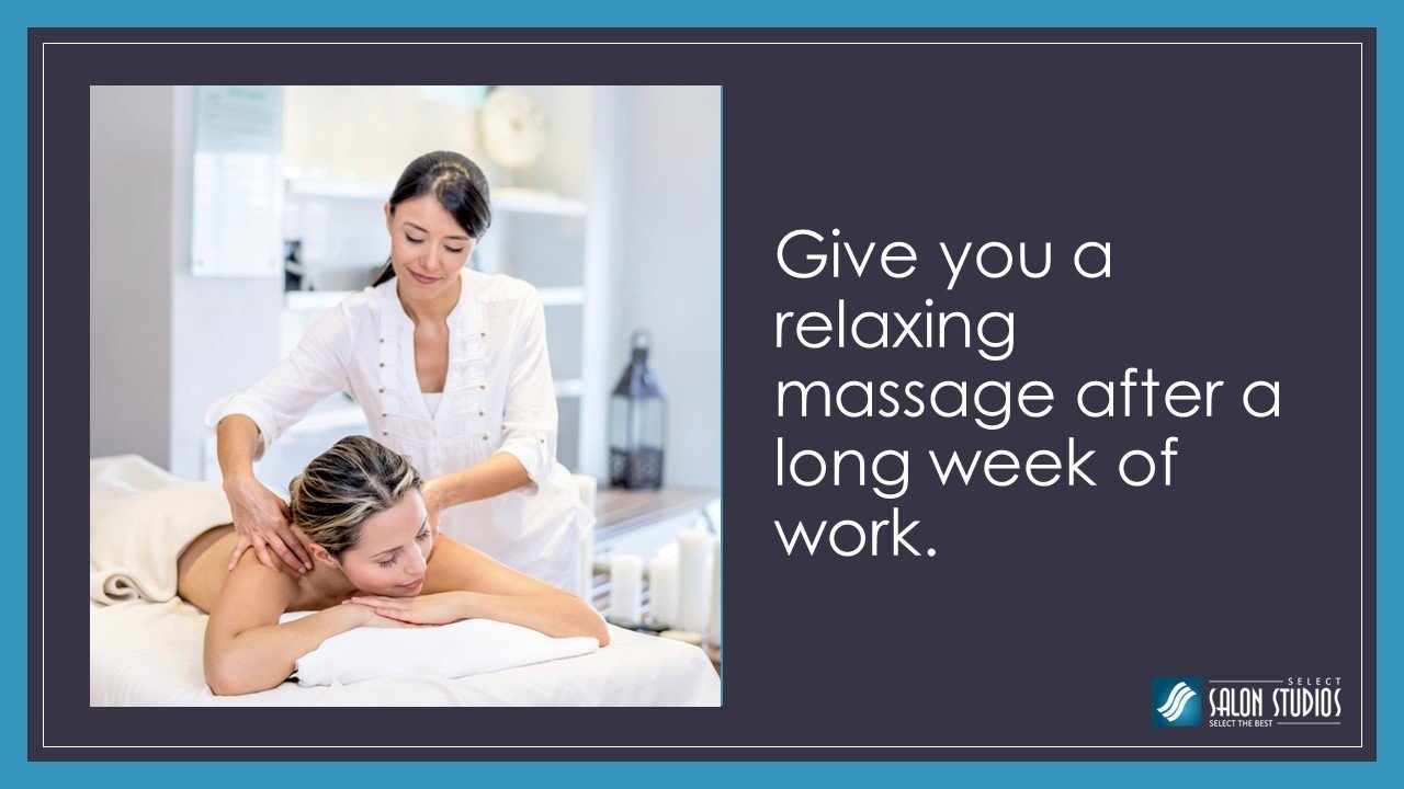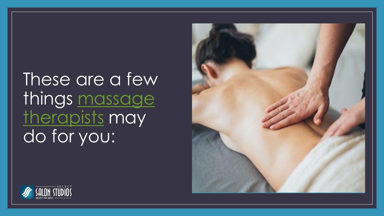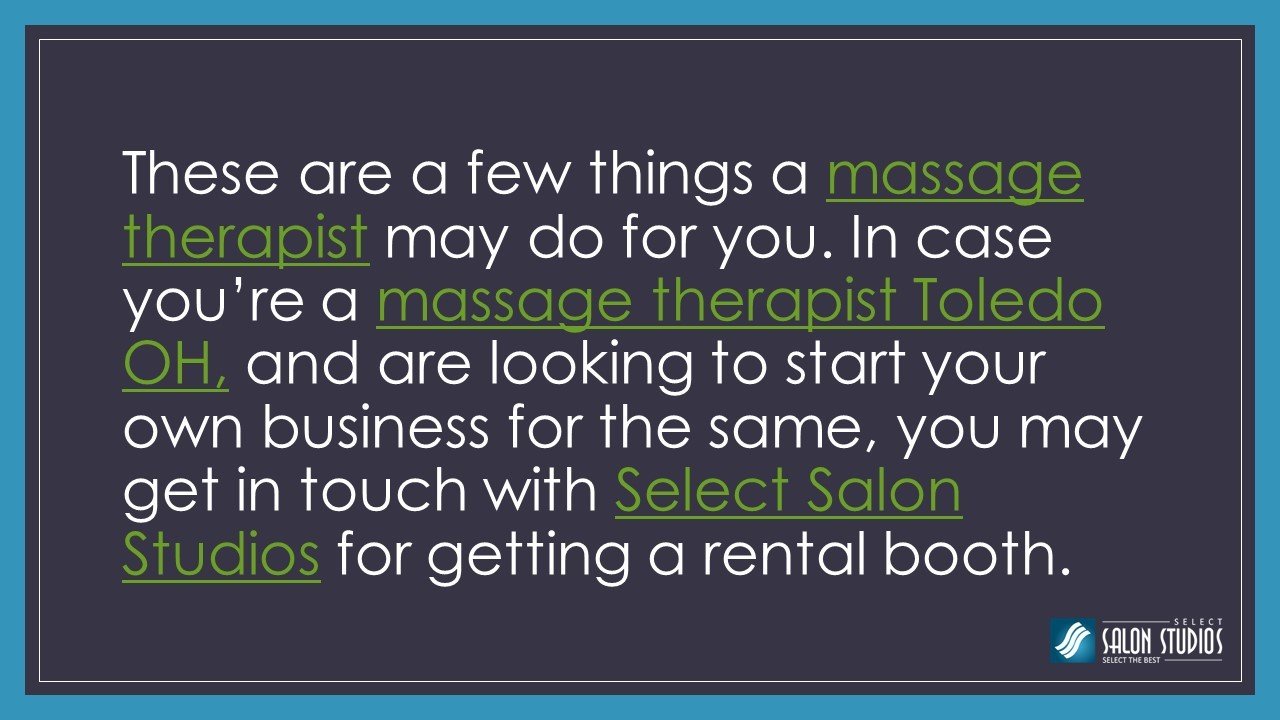 These are a few things a massage therapist may do for you. In case you’re a massage therapist Toledo OH, and are looking to start your own business for the same, you may get in touch with Select Salon Studios for getting a rental booth. http://www.selectsalonstudios.com/maumee-ohio/