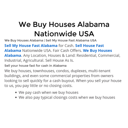 We Buy Houses Alabama | Sell My House Fast Alabama USA Sell My House Fast Alabama for Cash. Sell House Fast Alabama Nationwide USA. Fair Cash Offers. We Buy Houses Alabama. Any Location, Houses & Land