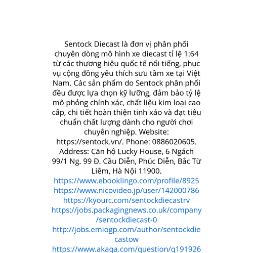 Website: https://sentock.vn/. Sentock Diecast là đơn vị phân phối chuyên dòng mô hình xe diecast tỉ lệ 1:64 từ các thương hiệu quốc tế nổi tiếng, phục vụ cộng đồng yêu thích sưu tầm xe tại Việt Nam. Các sản phẩm do Sentock phân phối đều được lựa chọn