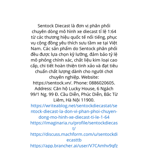 Website: https://sentock.vn/. Sentock Diecast là đơn vị phân phối chuyên dòng mô hình xe diecast tỉ lệ 1:64 từ các thương hiệu quốc tế nổi tiếng, phục vụ cộng đồng yêu thích sưu tầm xe tại Việt Nam. Các sản phẩm do Sentock phân phối đều được lựa chọn