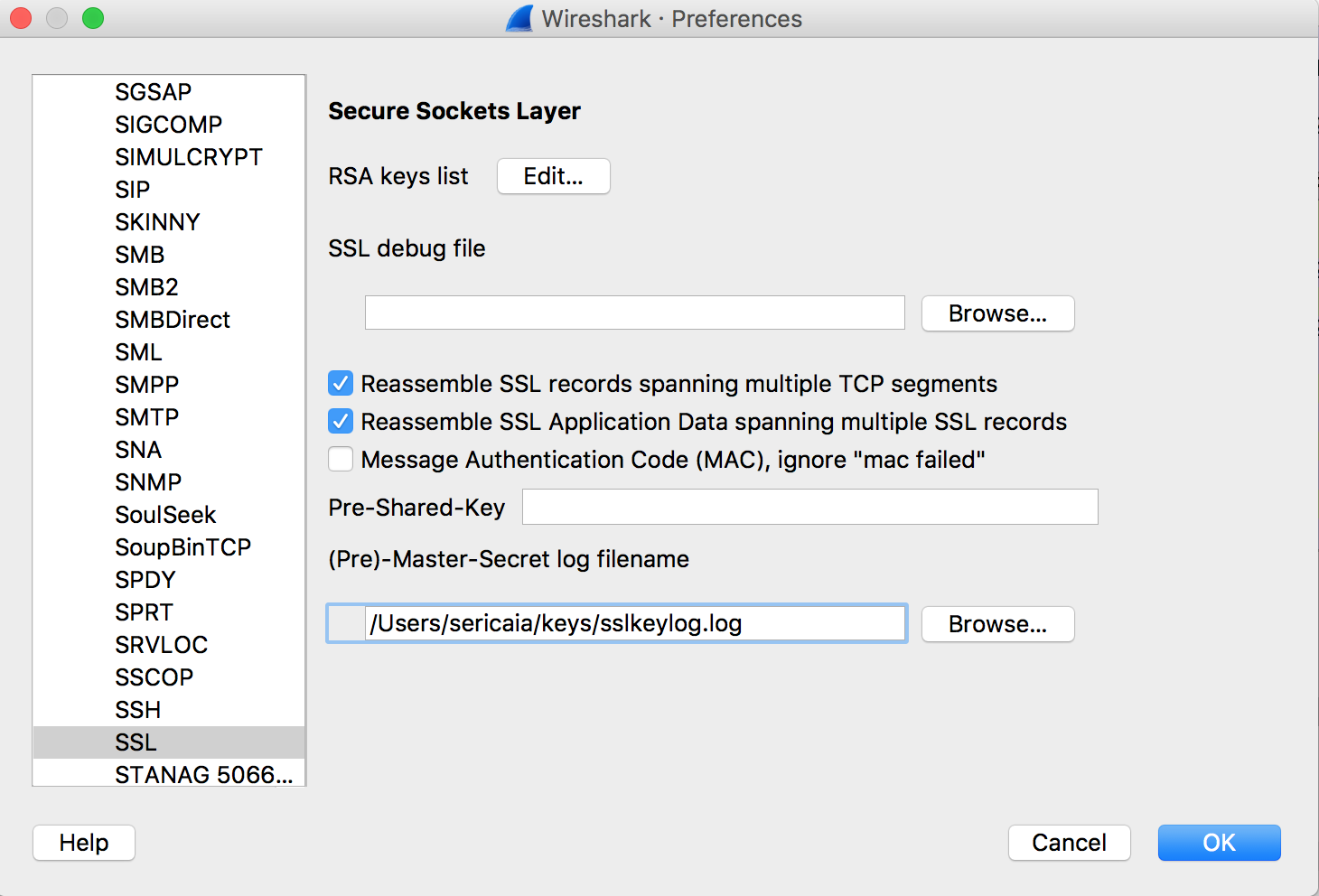 add key location on Wireshark SSL preferences