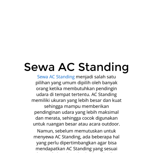 Sewa AC Standing adalah layanan penyewaan perangkat pendingin udara yang berukuran besar dan berdiri sendiri, biasanya digunakan untuk ruangan besar atau acara outdoor yang membutuhkan pendingin udara yang kuat dan merata. AC Standing memiliki kapasitas pendinginan yang lebih besar dan kuat dibandingkan dengan jenis AC portabel atau AC window, sehingga mampu memberikan suhu yang lebih stabil dan merata di seluruh ruangan. sewa ac standing Sewa AC Standing biasanya dilakukan oleh perusahaan, instansi pemerintah, atau perorangan yang membutuhkan pendingin udara dalam jangka waktu tertentu, seperti acara seminar, konser, pesta pernikahan, atau kegiatan outdoor lainnya. Dalam menyewa AC Standing, pelanggan dapat memilih kapasitas dan jumlah unit AC Standing yang sesuai dengan kebutuhan, serta durasi sewa yang dibutuhkan. Keuntungan dari sewa AC Standing adalah kemudahan dan fleksibilitas penggunaan, karena pelanggan tidak perlu membeli AC Standing secara permanen dan hanya membayar biaya sewa sesuai dengan durasi penggunaan. Selain itu, penyedia jasa sewa AC Standing juga biasanya menyediakan layanan pengiriman, pemasangan, dan penjemputan AC Standing setelah masa sewa berakhir, sehingga pelanggan tidak perlu repot dalam mengatur hal tersebut. Namun, sebelum memutuskan untuk menyewa AC Standing, pelanggan perlu mempertimbangkan kapasitas dan ukuran AC Standing yang sesuai dengan ruangan atau acara yang akan digunakan, serta harga sewa yang terjangkau dan kualitas AC Standing yang disewa. Pelanggan juga perlu memilih penyedia jasa sewa AC Standing yang terpercaya dan memiliki pengalaman dalam menyewakan perangkat tersebut, sehingga dapat memastikan kualitas dan layanan yang baik.
