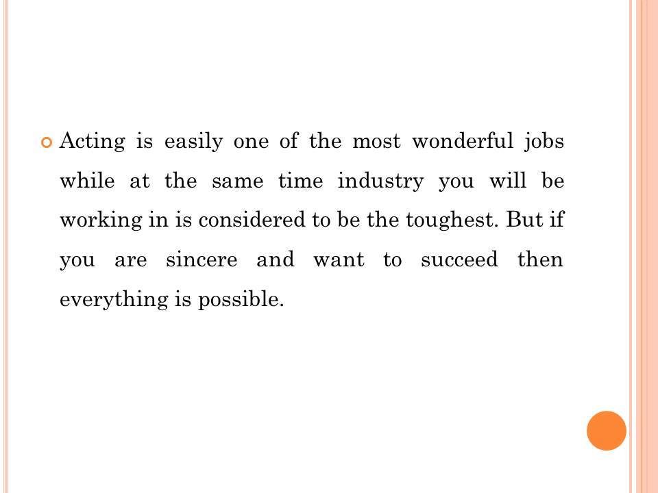 Acting is easily one of the most wonderful jobs while at the same time industry you will be working in is considered to be the toughest. But if you are sincere and really want to succeed then everything is possible.
