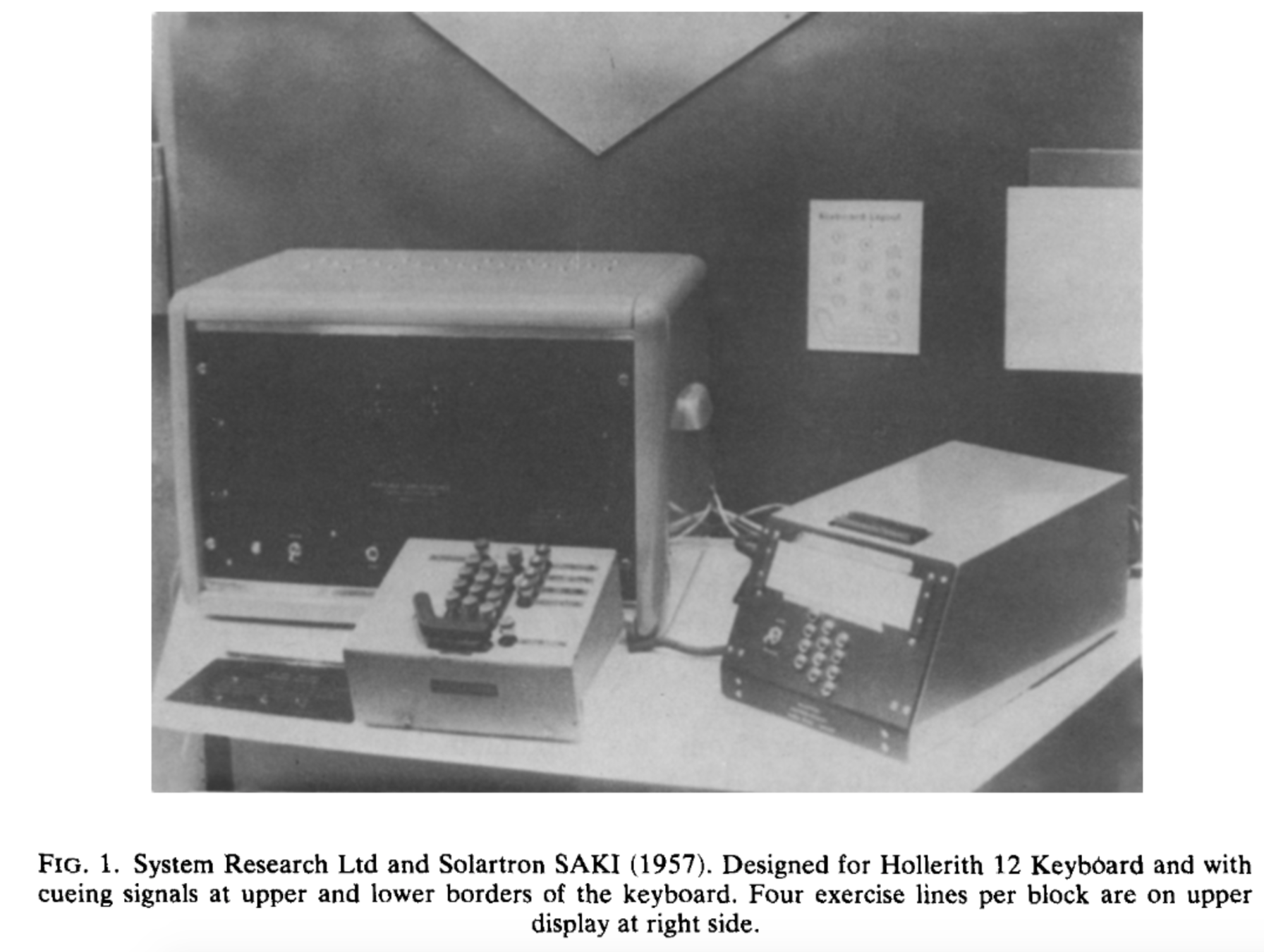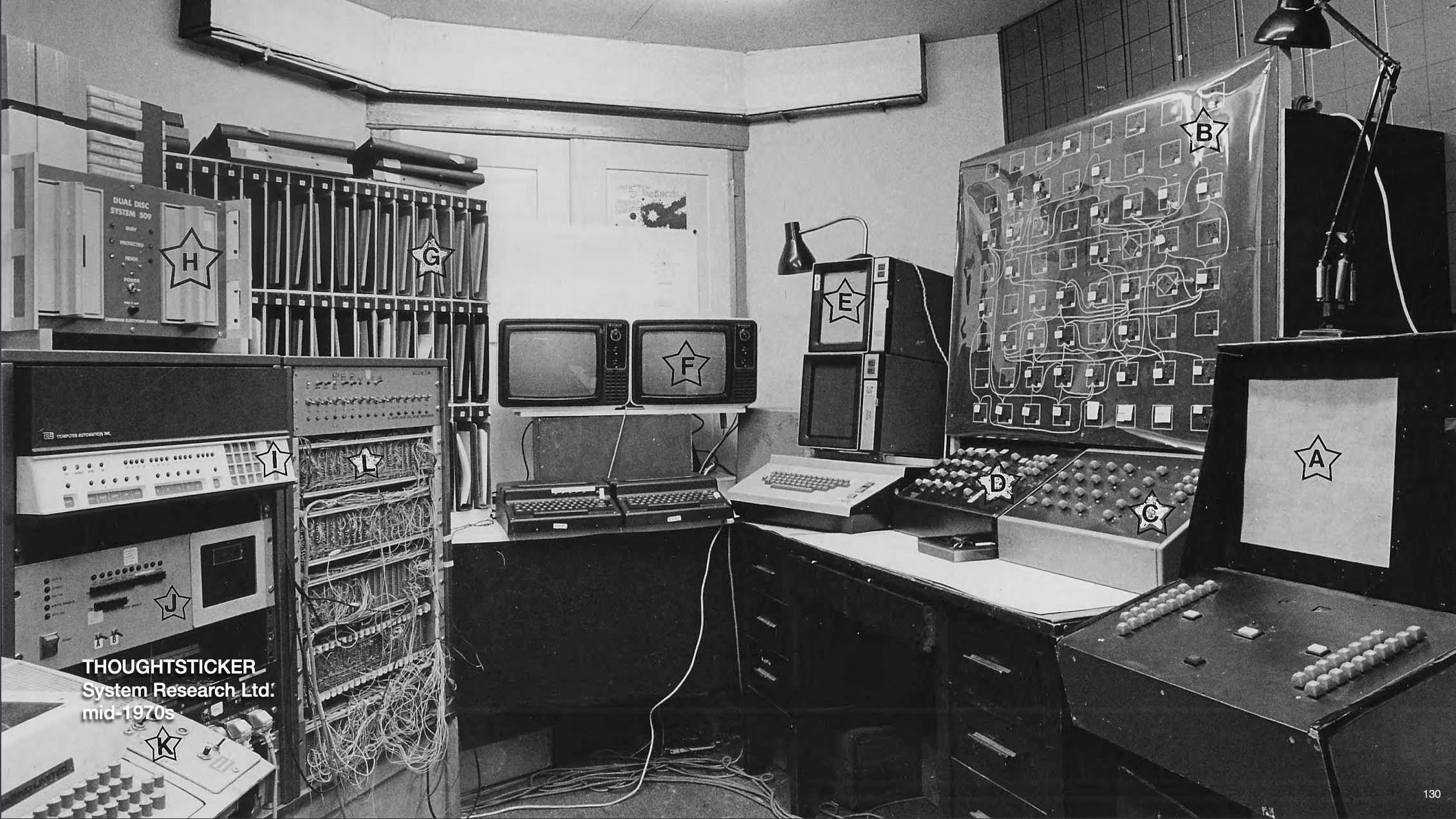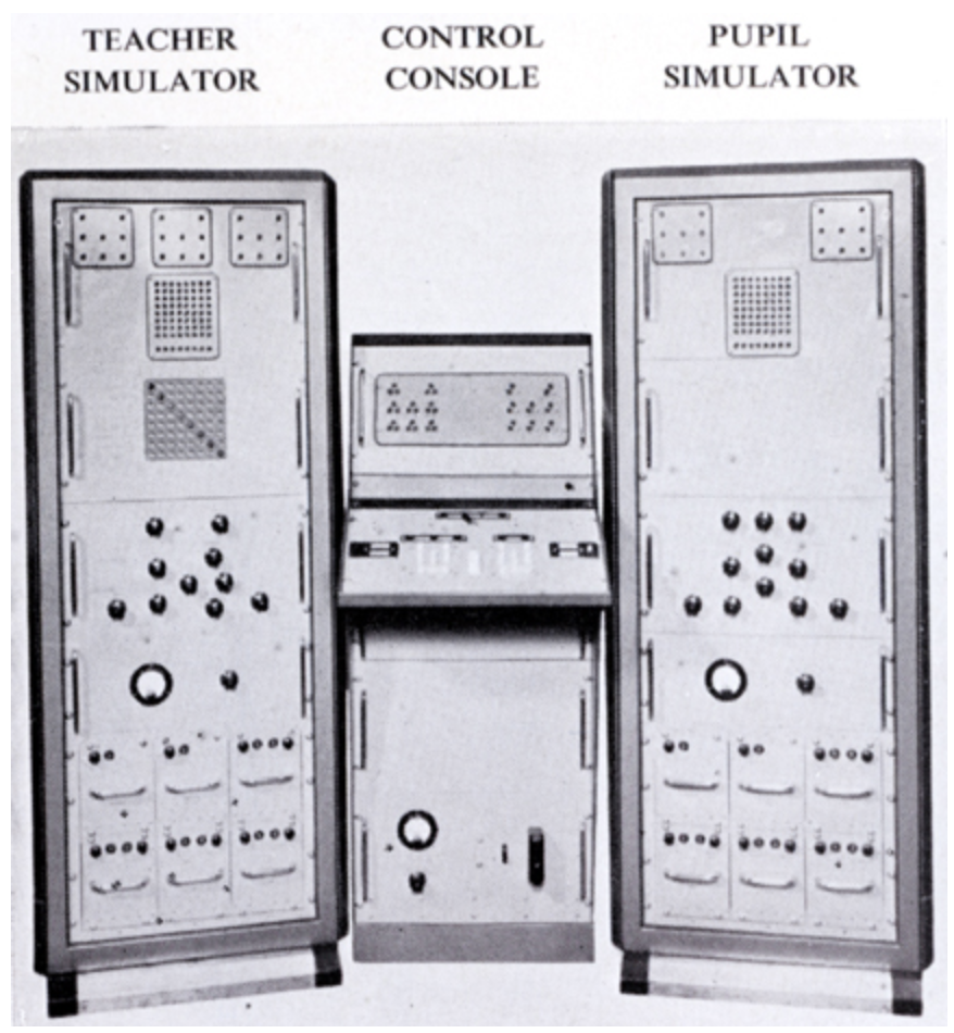"There was insufficient storage...in the mini-computer to allow for electronic display of a subject matter, but this was no discouragement to the implementors. The processor simply controlled a row of lights above a row of cubbyholes, each one containing a clipboard with a piece of paper on which the content was printed. The user responded to a lighted cubbyhole by extracting the clipboard and reading the material."