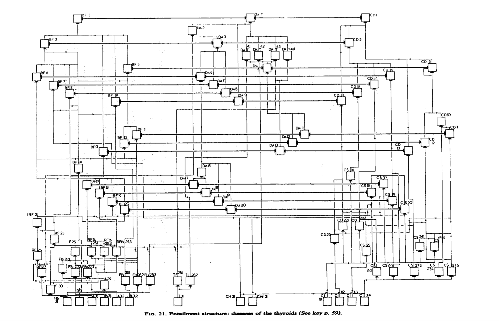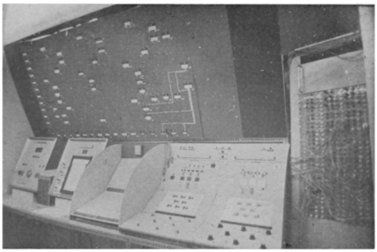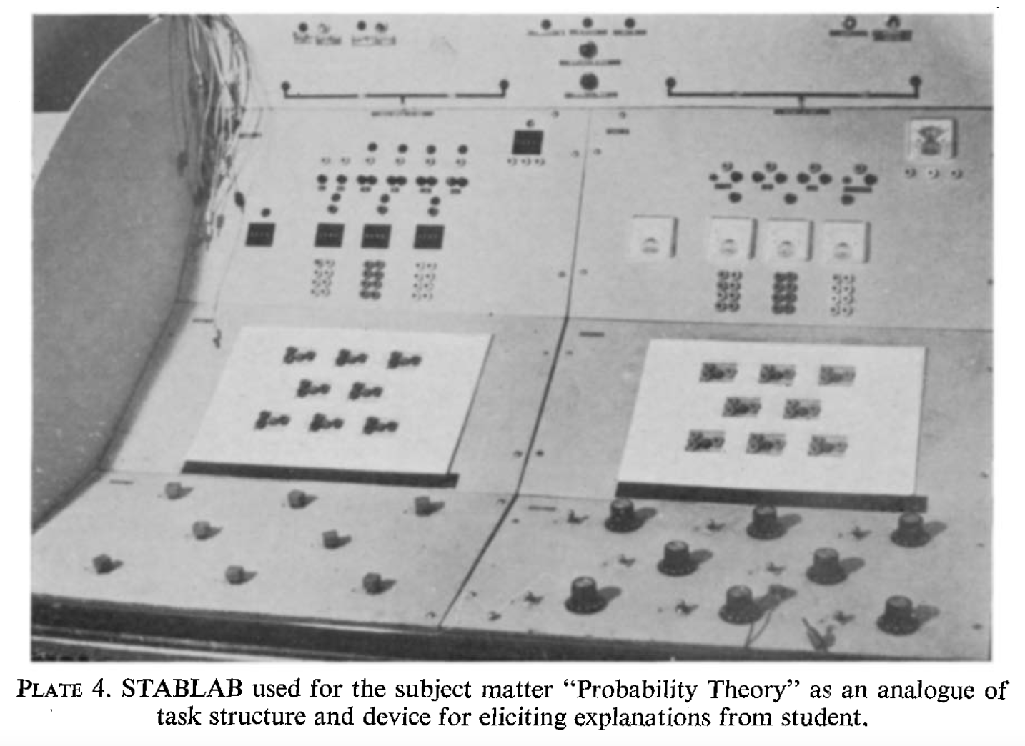 "There was insufficient storage...in the mini-computer to allow for electronic display of a subject matter, but this was no discouragement to the implementors. The processor simply controlled a row of lights above a row of cubbyholes, each one containing a clipboard with a piece of paper on which the content was printed. The user responded to a lighted cubbyhole by extracting the clipboard and reading the material."