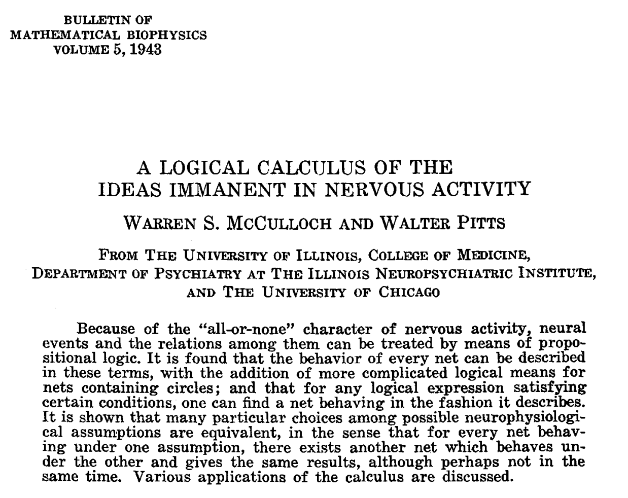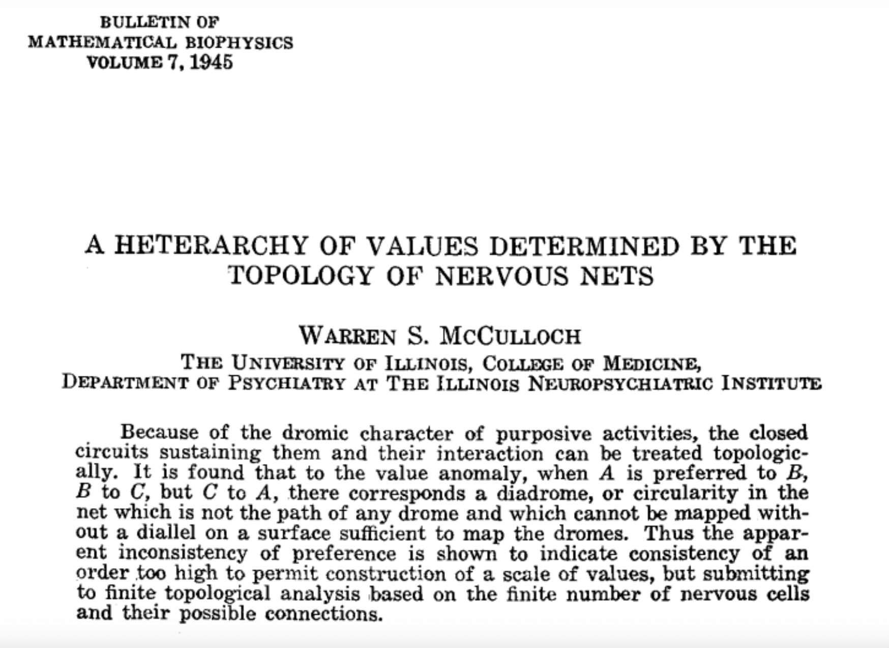 McCulloch, W. S. (1945). A heterarchy of values determined by the topology of nervous nets. The Bulletin of Mathematical Biophysics, 7, 89-93.