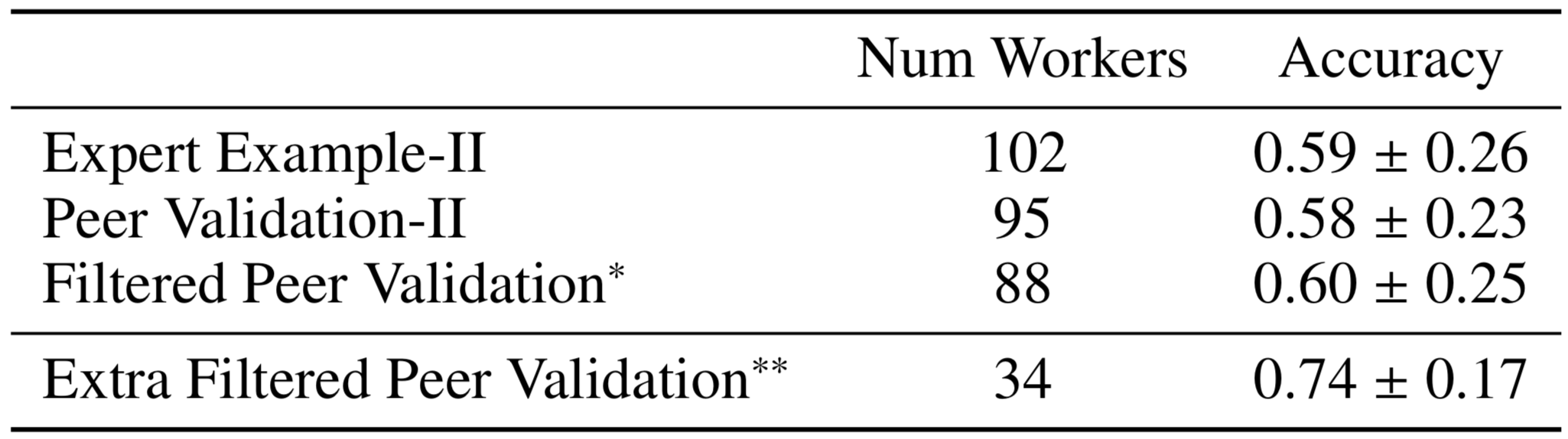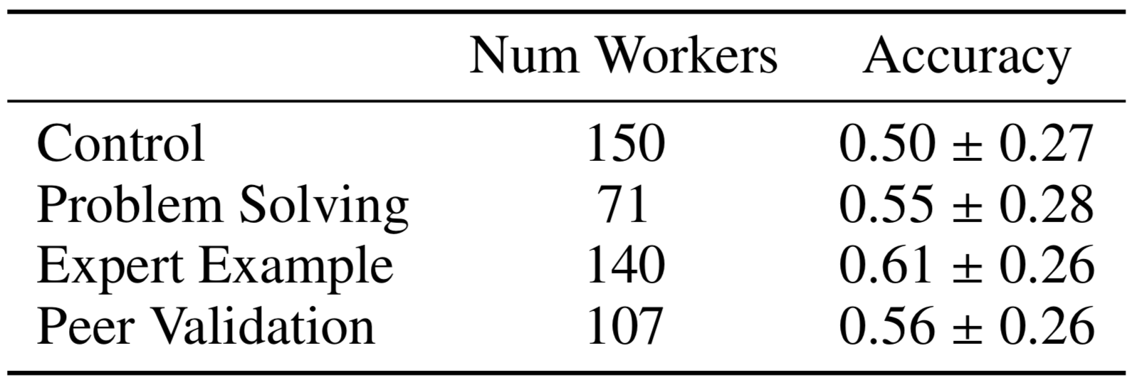 - Prior work has shown crowdsourced content can be used to create effective content---in some cases on par with expert content [Aleahmad et al. 2009; Williams et al., 2016; Whitehill & Seltzer, 2017].