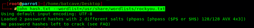 john hash.txt --wordlist=/usr/share/wordlists/rockyou.txt