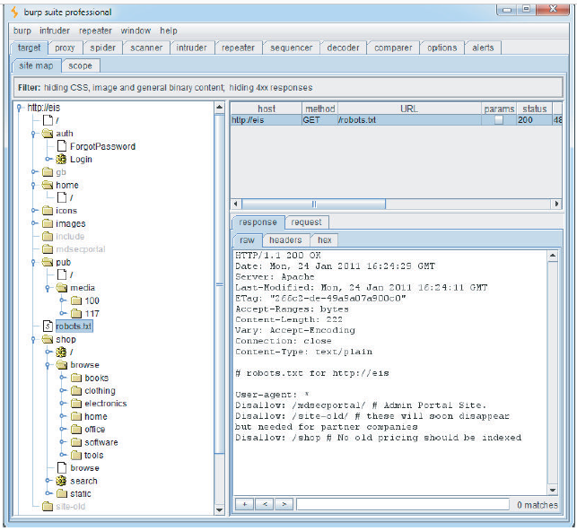 This is a more sophisticated and controlled technique that is usually preferable to automated spidering. Here, the user walks through the application in the normal way using a standard browser, attempting to navigate through all the application’s functionality. As he does so, the resulting traffic is passed through a tool combining an intercepting proxy and spider, which monitors all requests and responses. The tool builds a map of the application, incorporating all the URLs visited by the browser.