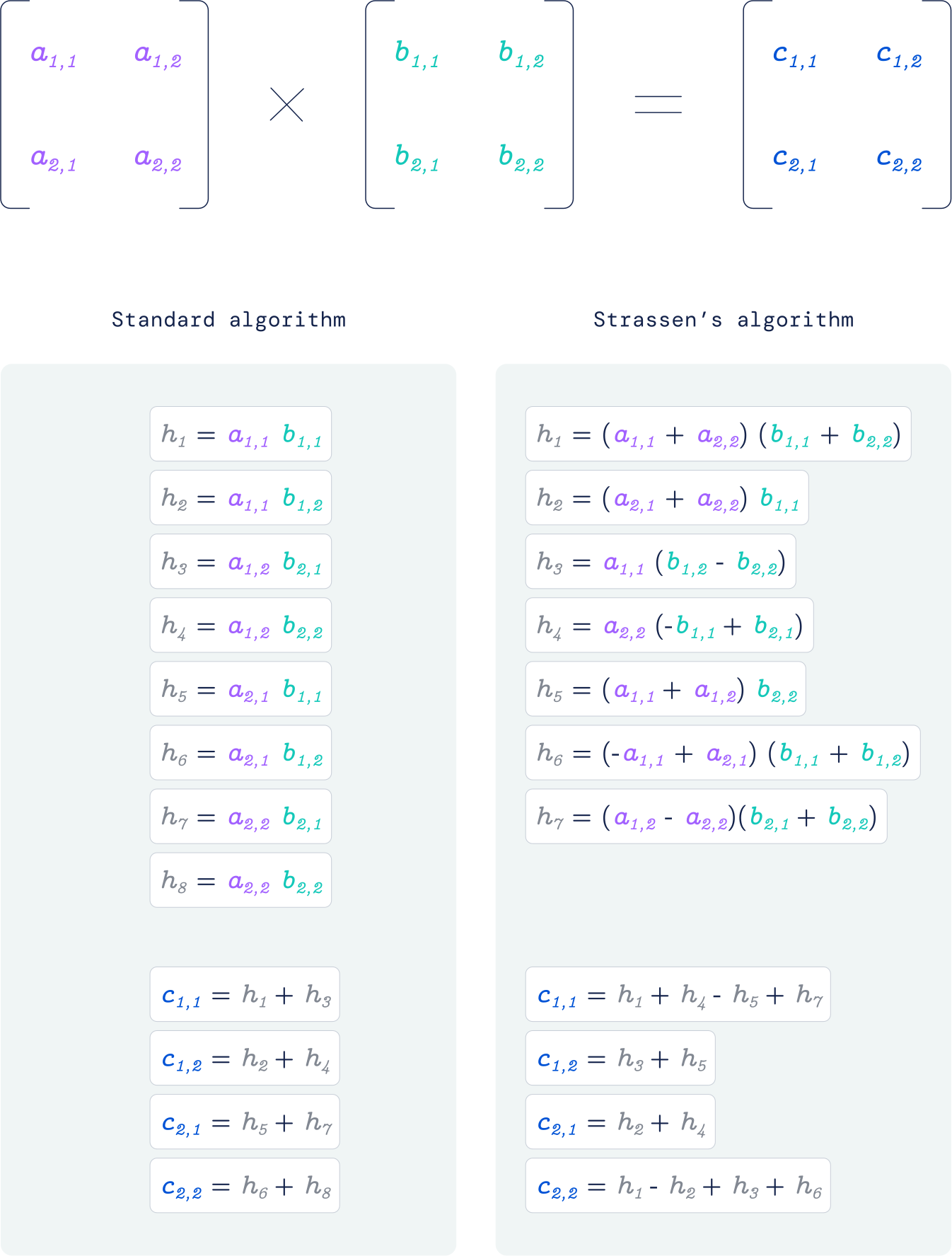 Matrix multiplication: the textbook uses 8 multiplications for 2×2. In 1969, Strassen showed 7 suffice.