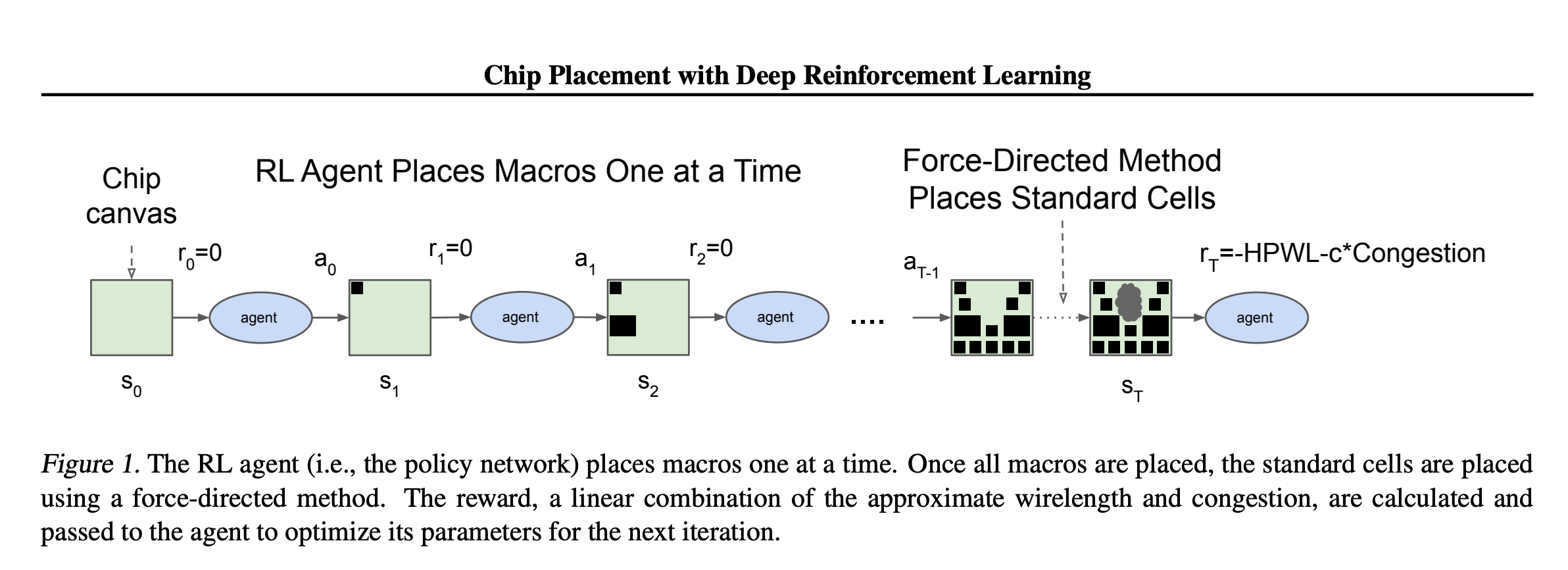 | \(\mathcal{S}\) | Partial layout, connectivity, congestion | \(\mathcal{A}\) | Place the next macro on the canvas |