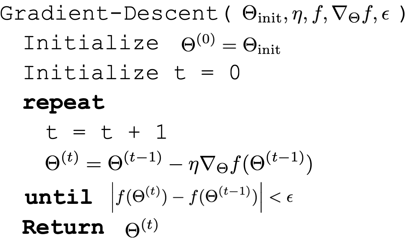- Gradient norm close to zero \(\left\|\nabla_{\Theta} f\left(\Theta^{(t)}\right)\right\|<\epsilon\)