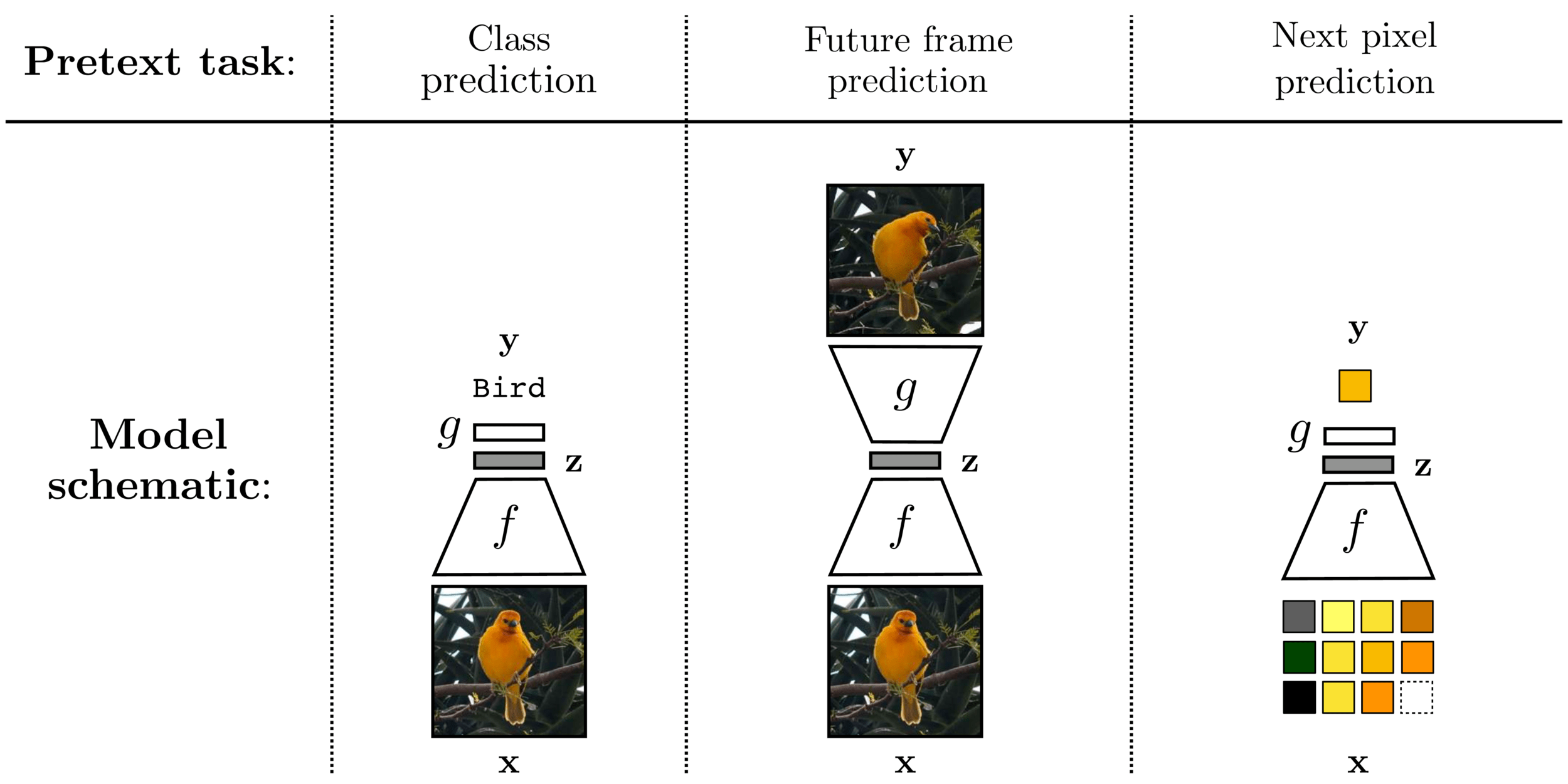 - Do so by cooking up “labels” (prediction targets) from the raw data itself — called pretext task