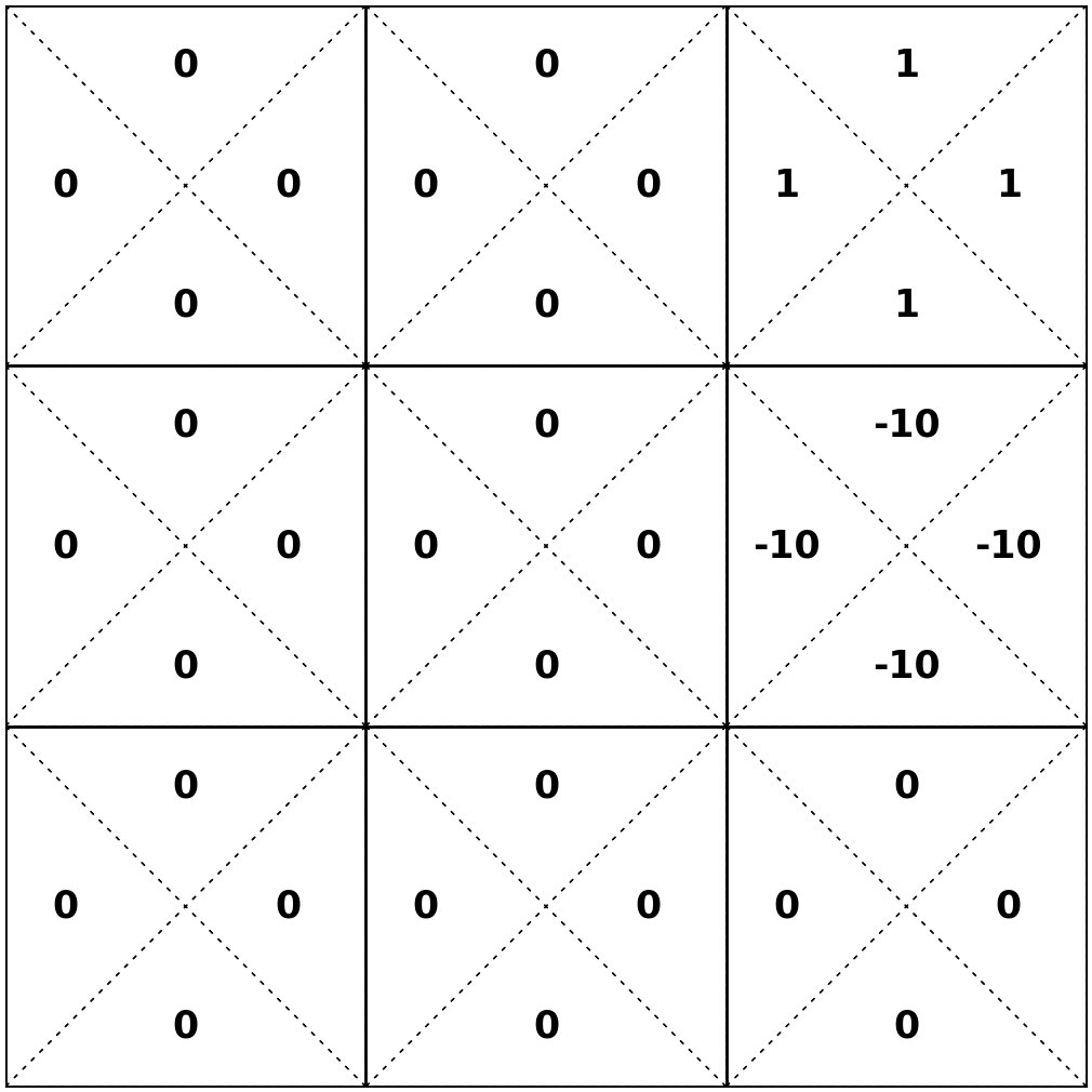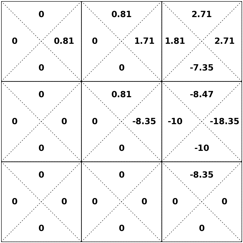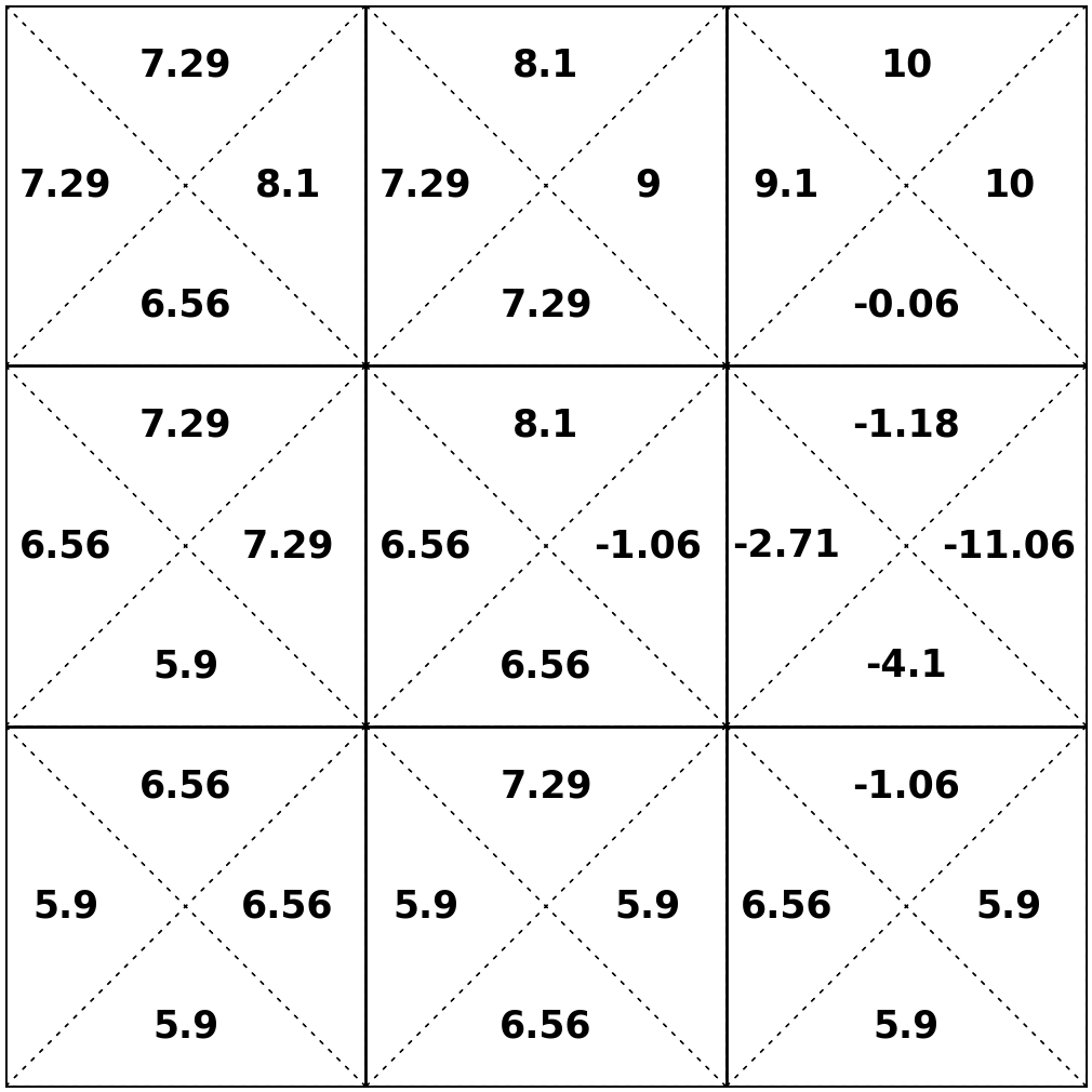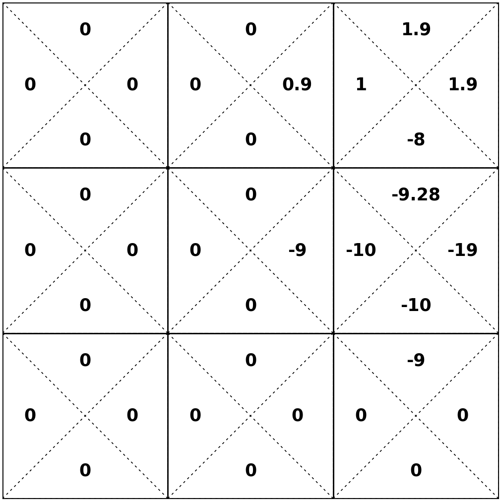 \(= -10 + .9 [.2 \times 0+ .8 \times 1] \Rightarrow -9.28\)
