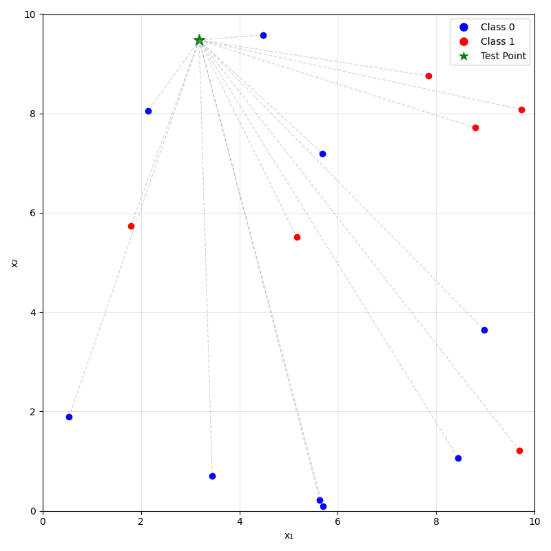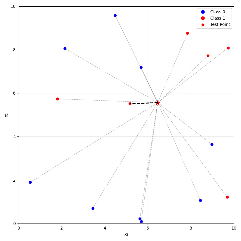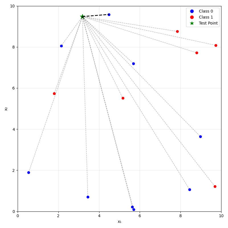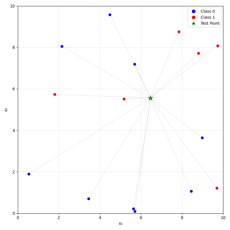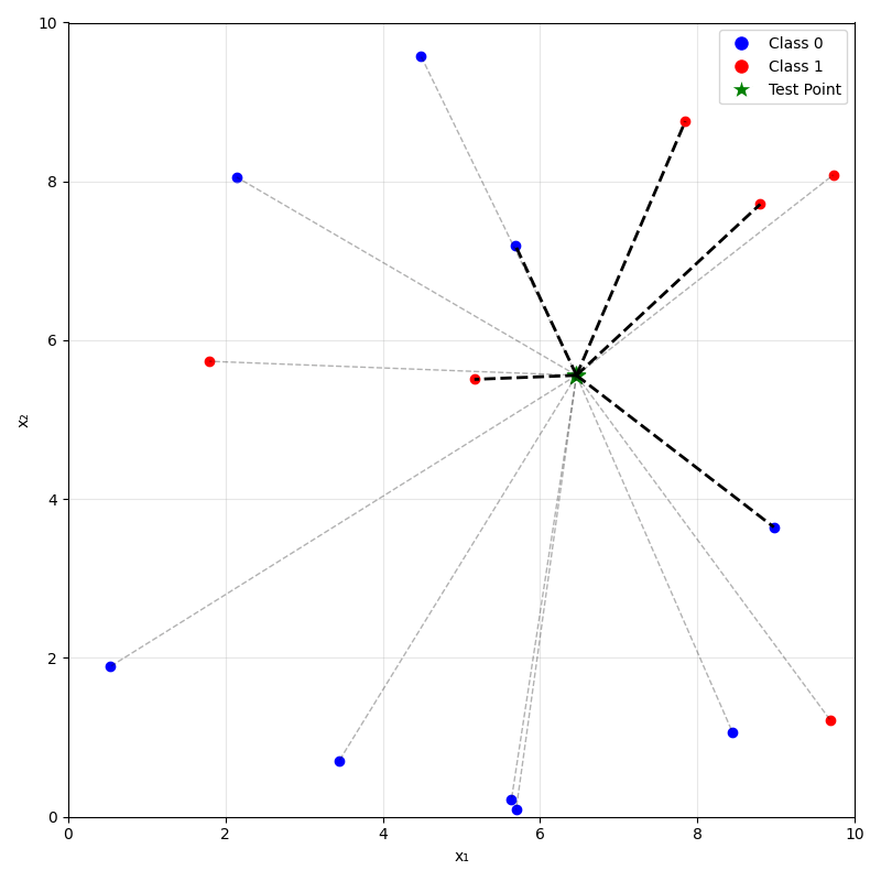 - For classification: predict label \(\hat{y}_{\text{new}}\) by taking a majority vote of the \(k\) neighbors's labels
