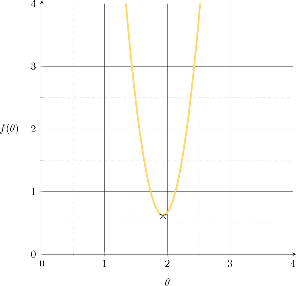 Want to fit a line (without offset) to minimize the MSE: \(f(\theta) = (3 \theta-6)^{2}\)