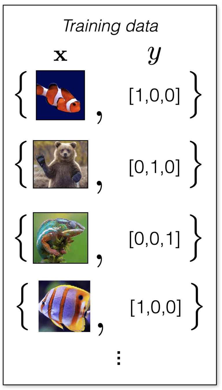 - Encode the \(K\) classes as an \(\mathbb{R}^K\) vector, with a single 1 (hot) and 0s elsewhere.