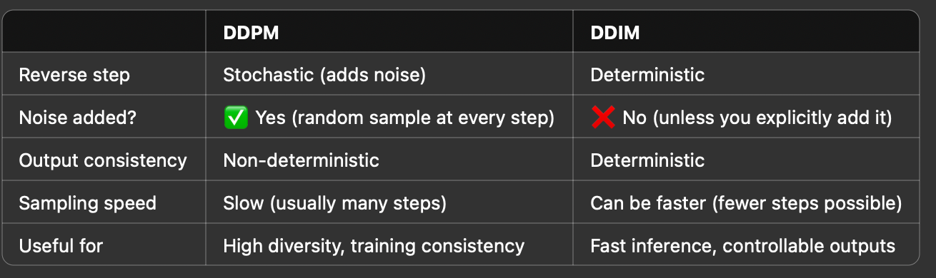- At inference time, we start from pure noise \( x_T \sim \mathcal{N}(0, I) \) and apply this backward chain to generate samples.