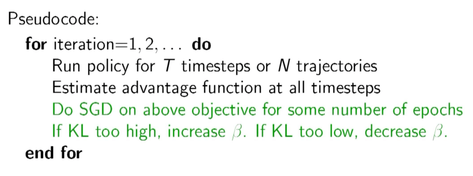 Constraint: \(\quad \mathbb{E}_{\pi_{\text {old }}}\left[K L\left(\pi \mid \pi_{\text {old }}\right)\right] \leq \epsilon\)