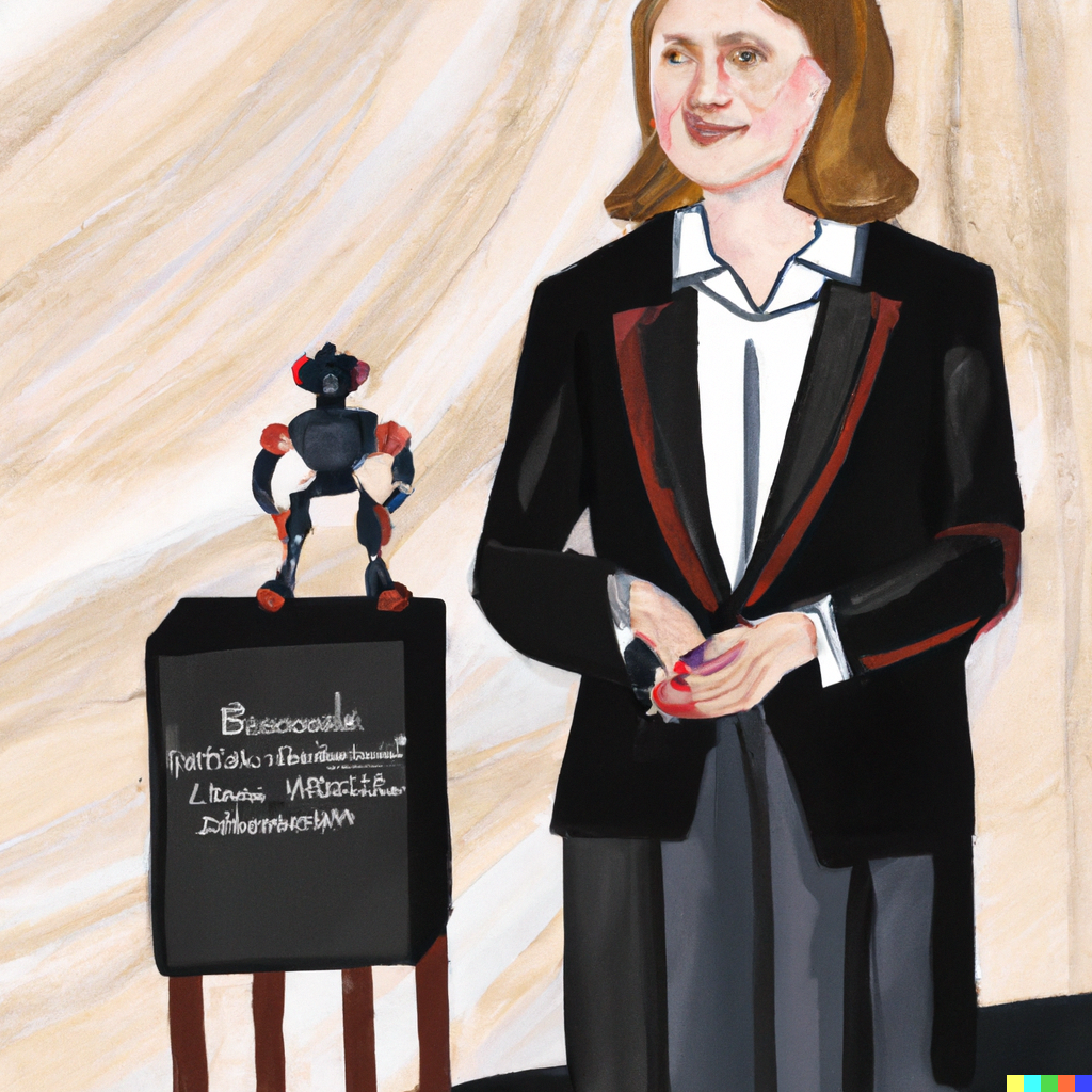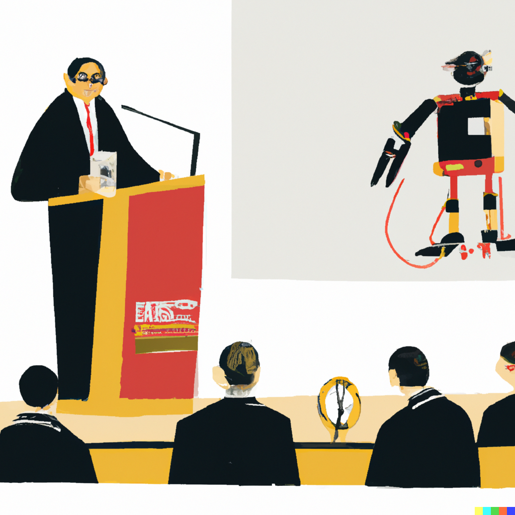 "A painting of a professor giving a talk at a robotics competition kickoff"
