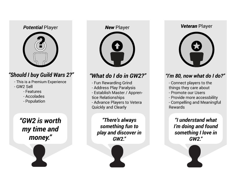 Focuses on revealing the world of Tyria and GW2 to new players. Contextually introduces content and community.