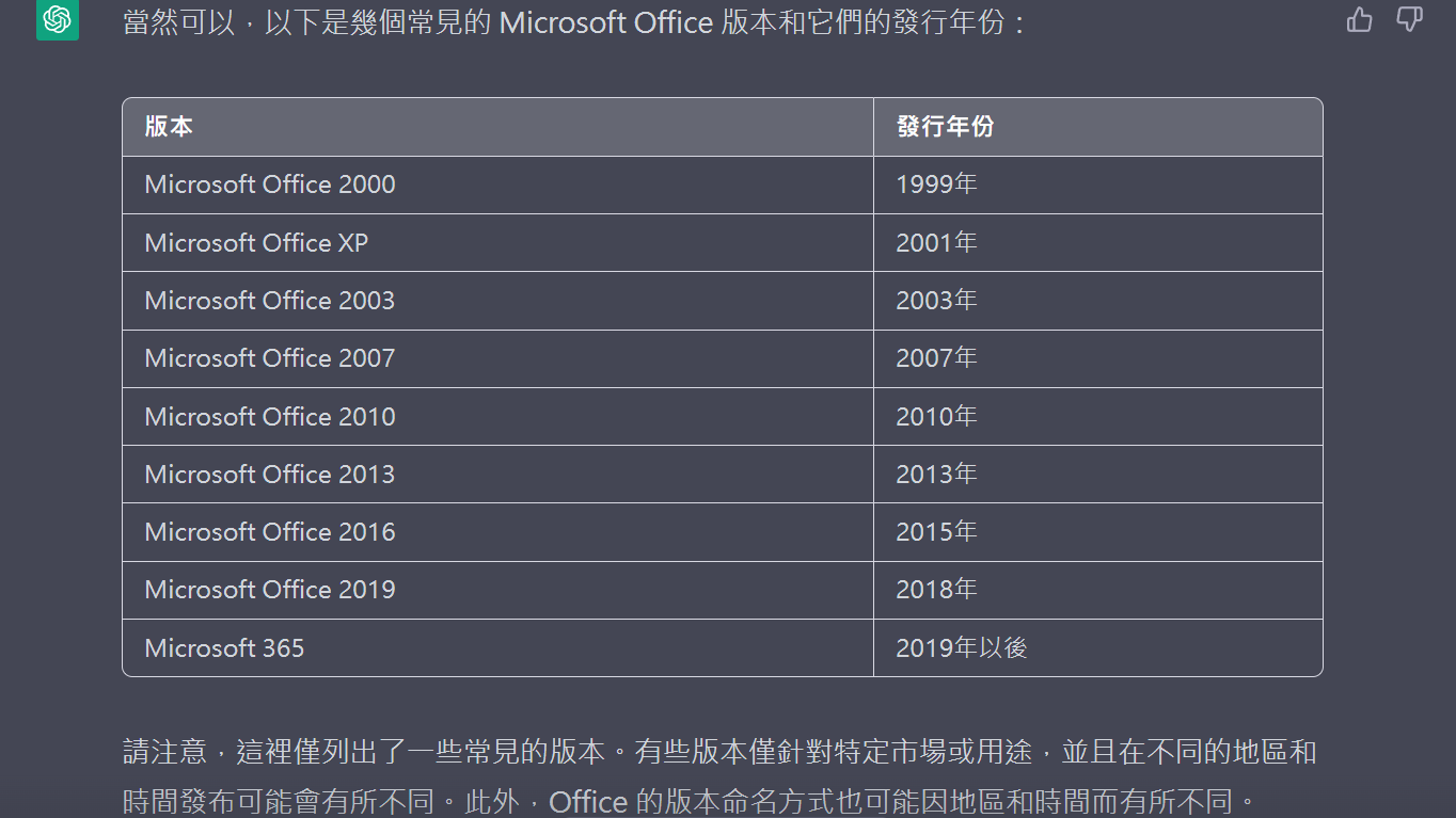 請問ChapGPT能不能夠列出您知道的Office版本呢,並以表格的方式呈現,欄位名稱分別為"版本" | “發行年份”