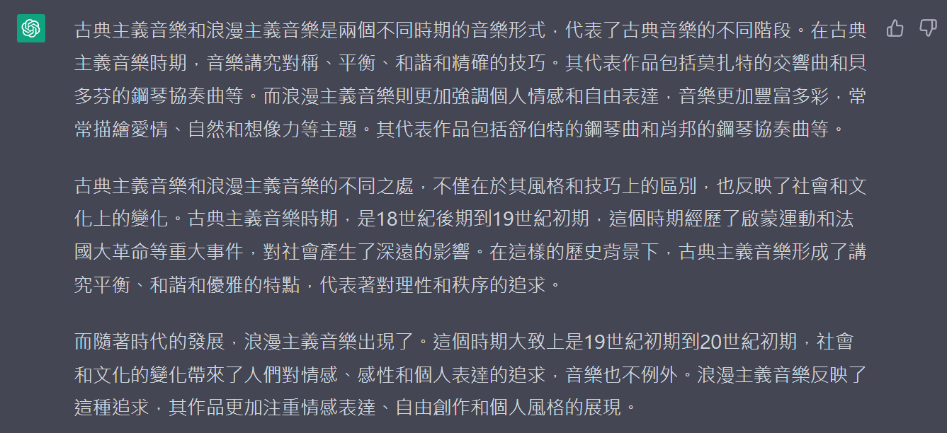 “古典主義音樂和浪漫主義音樂是兩個非常重要的音樂時期,它們代表了古典音樂發展的兩個不同階段。”