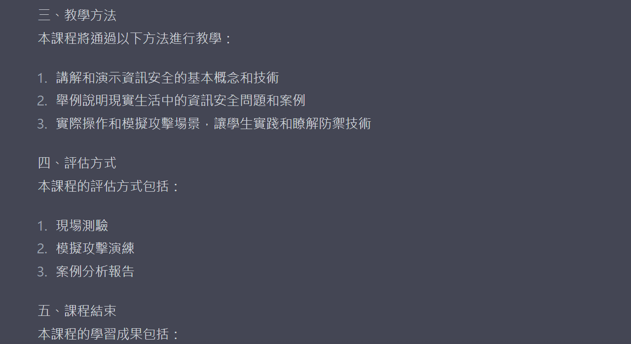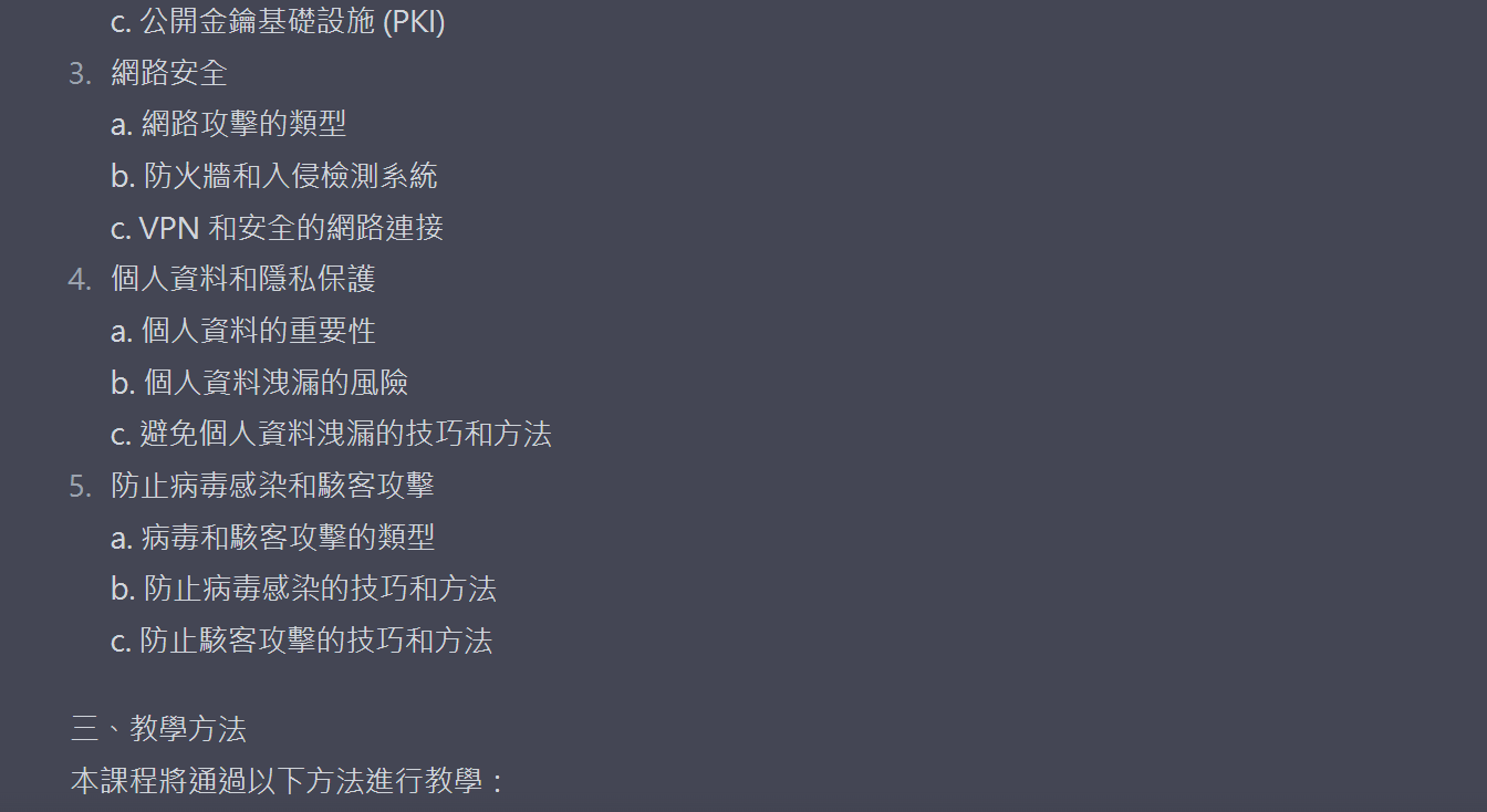 承上,請幫我針對課程內容和教學方法的各項資訊再補充一些簡要敘述