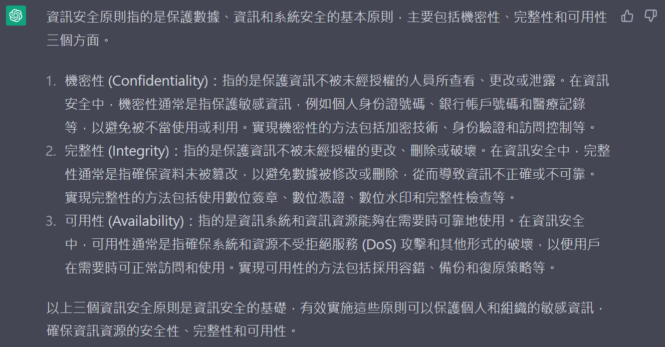請就「資訊安全原則:介紹資訊安全的三個基本原則,即機密性、完整性和可用性。」