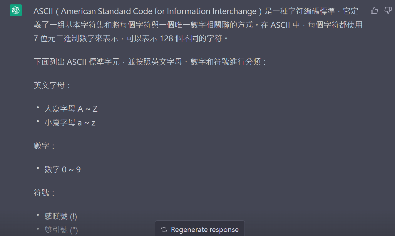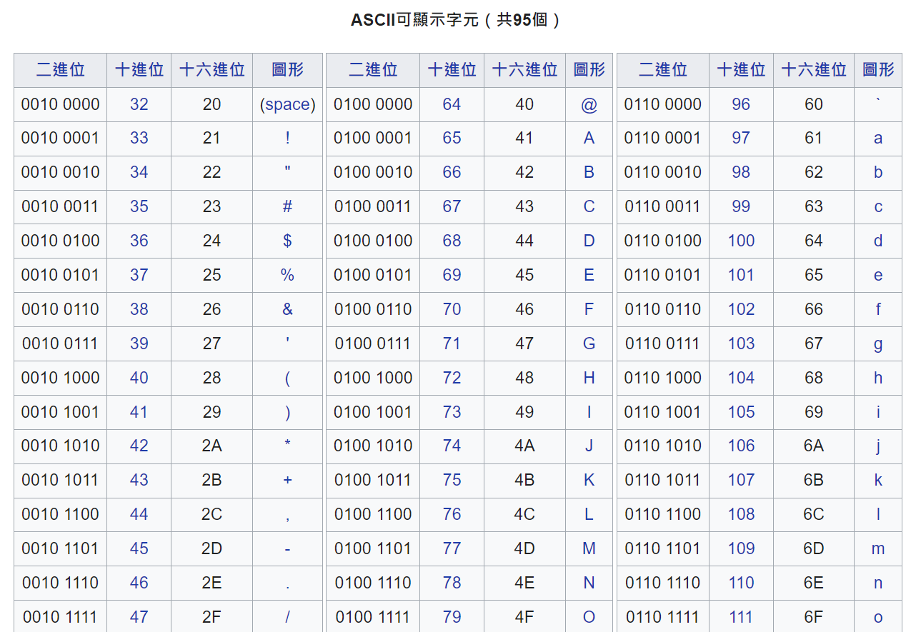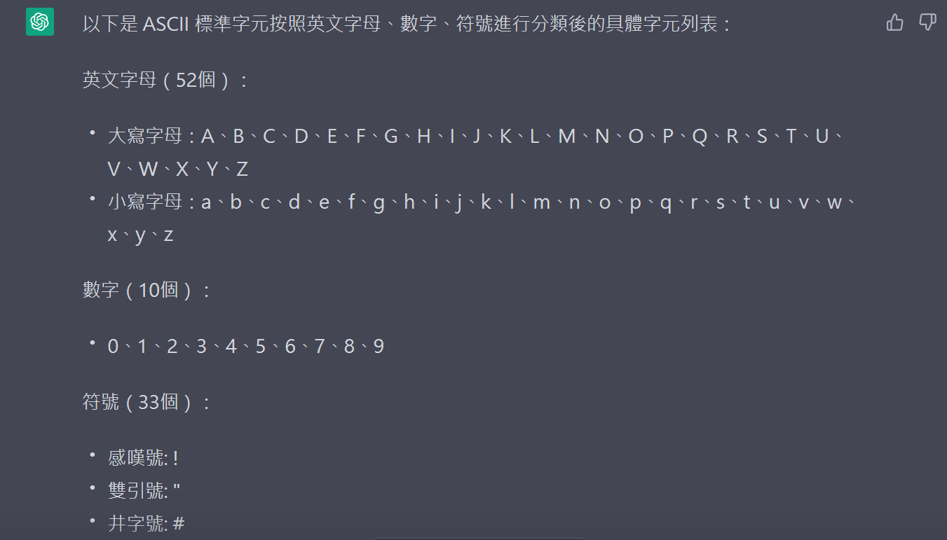 承上,請列出 ASCII 標準字元,並分為英文字母、數字、符號
