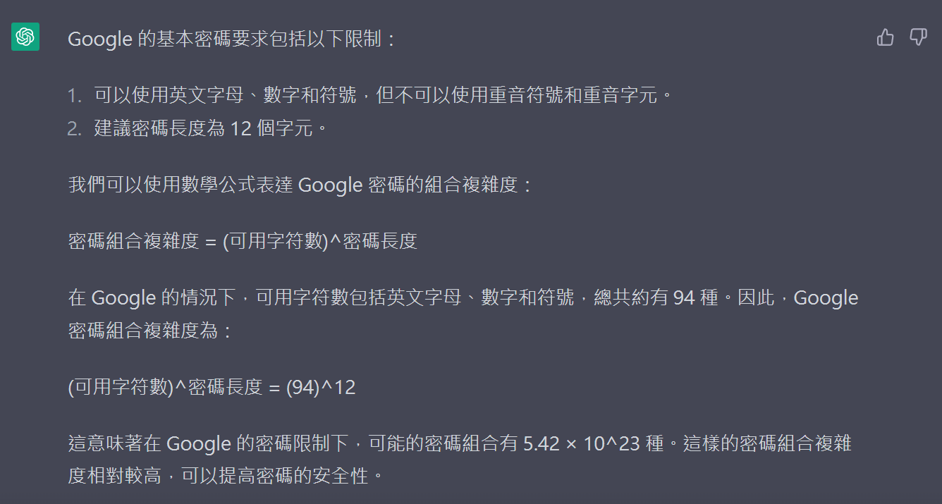 請ChatGPT協助計算密碼複雜度,請問如何以數學公式表達Google的密碼組合複雜度: