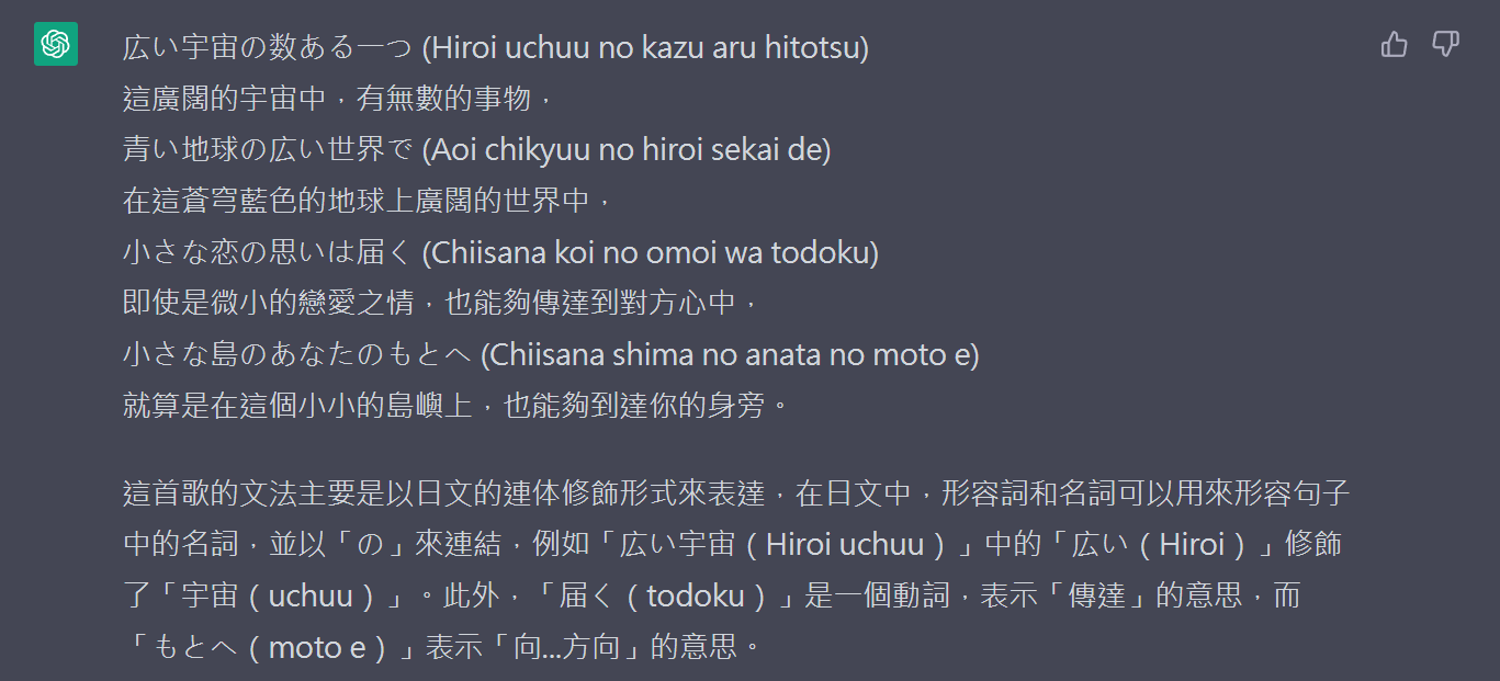 請作為一個日語老師,將我輸入的日文句子翻譯成繁體中文,同時在每句日文之後註記羅馬拼音,並使用繁體中文進行解釋和日文句子所使用的文法